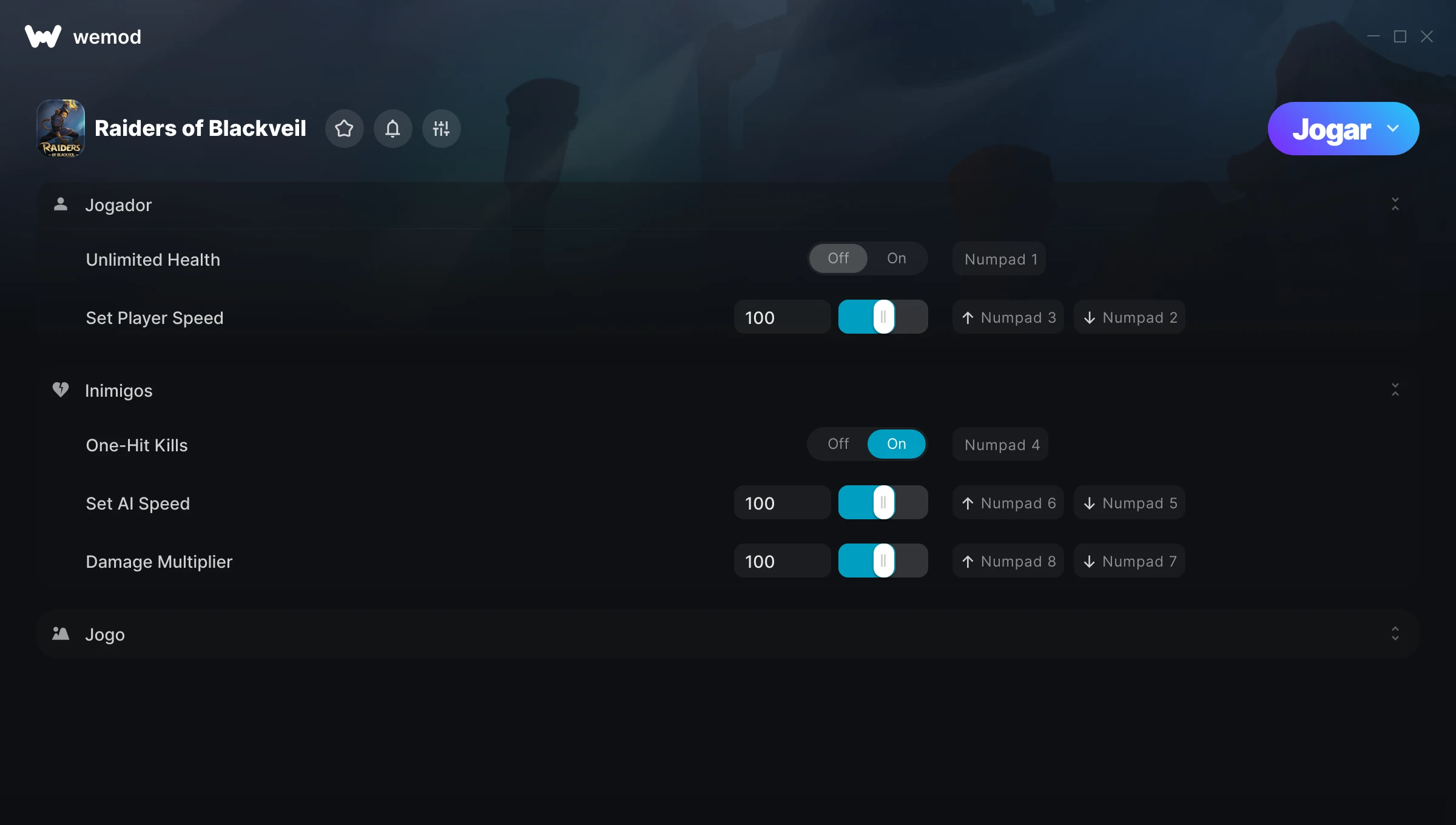 Como uso as trapaças em Raiders of Blackveil?O WeMod exibirá todos os jogos no seu PC com segurança. Abra um jogo da lista e simplesmente pressione Jogar. Depois que o jogo for carregado e você estiver no jogo, você poderá começar a ativar diferentes trapaças!Vai funcionar com a minha versão do jogo?O WeMod usa tecnologia avançada para detectar a versão do jogo que você está rodando e avisar se é suportada. Se não for, você ainda terá a opção de tentar assim mesmo ou solicitar uma atualização!