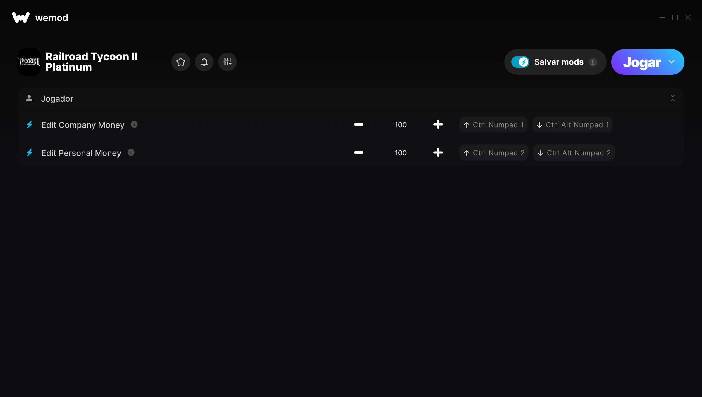 Como uso as trapaças em Railroad Tycoon II Platinum?O WeMod exibirá todos os jogos no seu PC com segurança. Abra um jogo da lista e simplesmente pressione Jogar. Depois que o jogo for carregado e você estiver no jogo, você poderá começar a ativar diferentes trapaças!Vai funcionar com a minha versão do jogo?O WeMod usa tecnologia avançada para detectar a versão do jogo que você está rodando e avisar se é suportada. Se não for, você ainda terá a opção de tentar assim mesmo ou solicitar uma atualização!