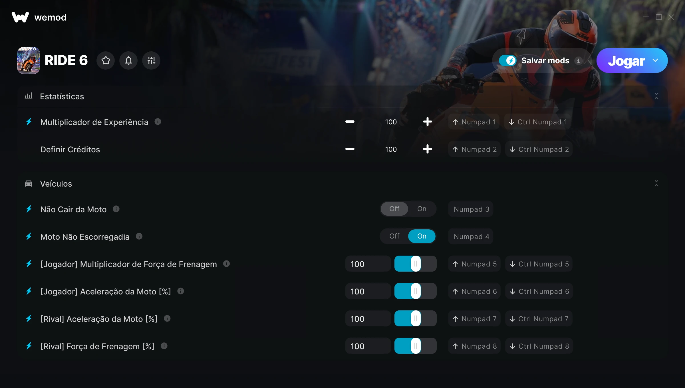 Como uso as trapaças em RIDE 6?O WeMod exibirá todos os jogos no seu PC com segurança. Abra um jogo da lista e simplesmente pressione Jogar. Depois que o jogo for carregado e você estiver no jogo, você poderá começar a ativar diferentes trapaças!Vai funcionar com a minha versão do jogo?O WeMod usa tecnologia avançada para detectar a versão do jogo que você está rodando e avisar se é suportada. Se não for, você ainda terá a opção de tentar assim mesmo ou solicitar uma atualização!