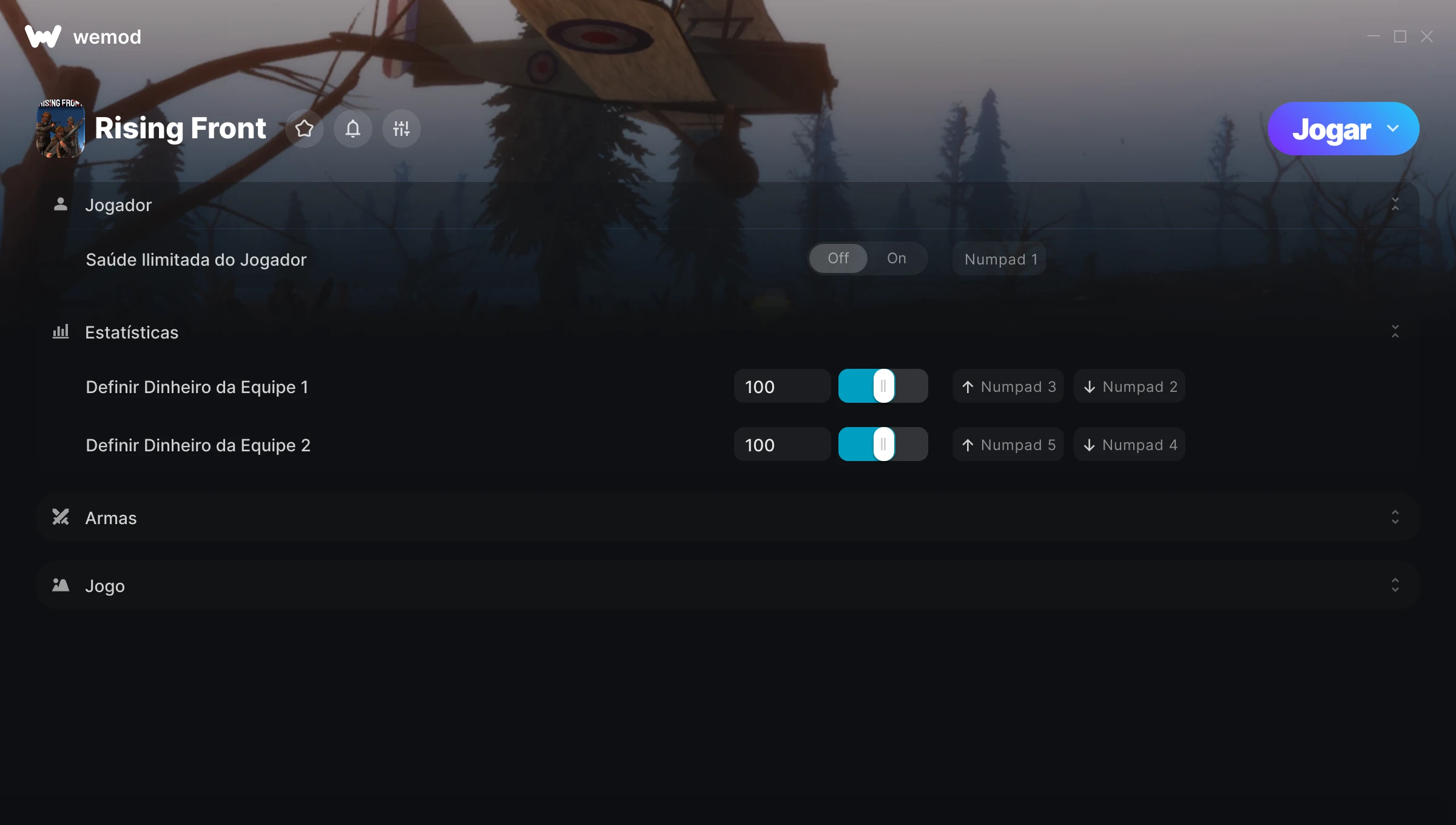 Como uso as trapaças em Rising Front?O WeMod exibirá todos os jogos no seu PC com segurança. Abra um jogo da lista e simplesmente pressione Jogar. Depois que o jogo for carregado e você estiver no jogo, você poderá começar a ativar diferentes trapaças!Vai funcionar com a minha versão do jogo?O WeMod usa tecnologia avançada para detectar a versão do jogo que você está rodando e avisar se é suportada. Se não for, você ainda terá a opção de tentar assim mesmo ou solicitar uma atualização!