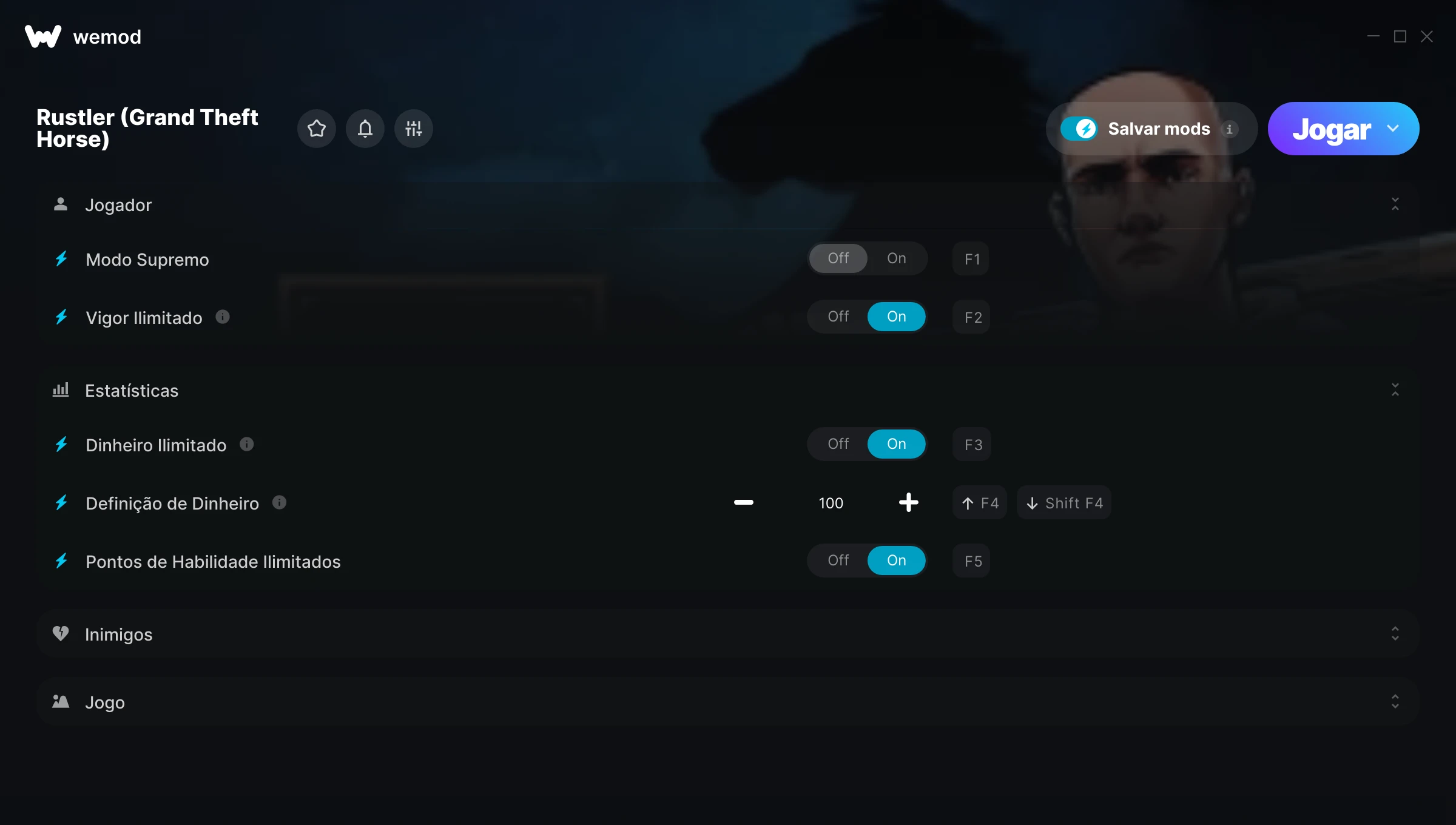 Como uso as trapaças em Rustler (Grand Theft Horse)?O WeMod exibirá todos os jogos no seu PC com segurança. Abra um jogo da lista e simplesmente pressione Jogar. Depois que o jogo for carregado e você estiver no jogo, você poderá começar a ativar diferentes trapaças!Vai funcionar com a minha versão do jogo?O WeMod usa tecnologia avançada para detectar a versão do jogo que você está rodando e avisar se é suportada. Se não for, você ainda terá a opção de tentar assim mesmo ou solicitar uma atualização!