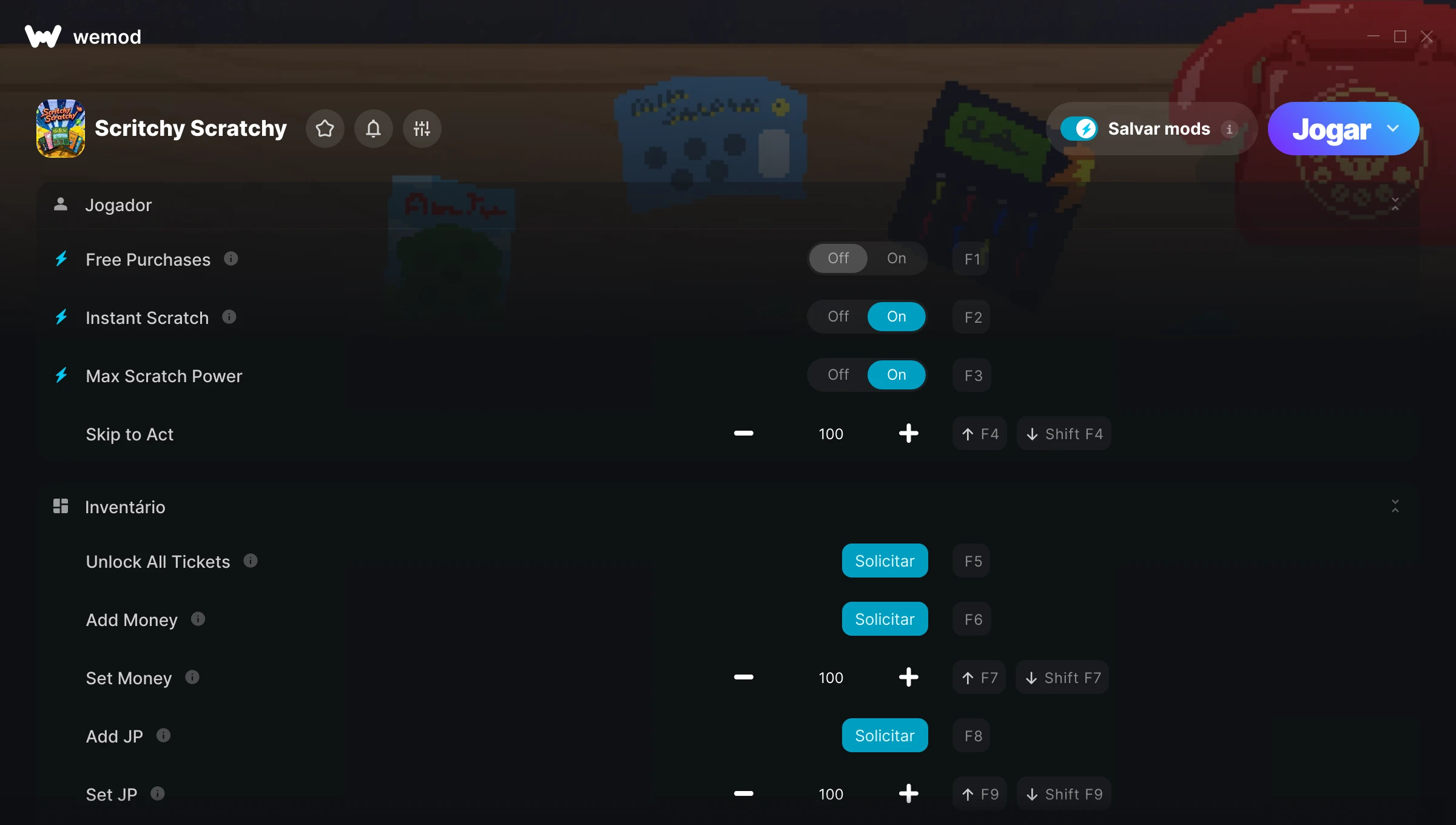 Como uso as trapaças em Scritchy Scratchy?O WeMod exibirá todos os jogos no seu PC com segurança. Abra um jogo da lista e simplesmente pressione Jogar. Depois que o jogo for carregado e você estiver no jogo, você poderá começar a ativar diferentes trapaças!Vai funcionar com a minha versão do jogo?O WeMod usa tecnologia avançada para detectar a versão do jogo que você está rodando e avisar se é suportada. Se não for, você ainda terá a opção de tentar assim mesmo ou solicitar uma atualização!