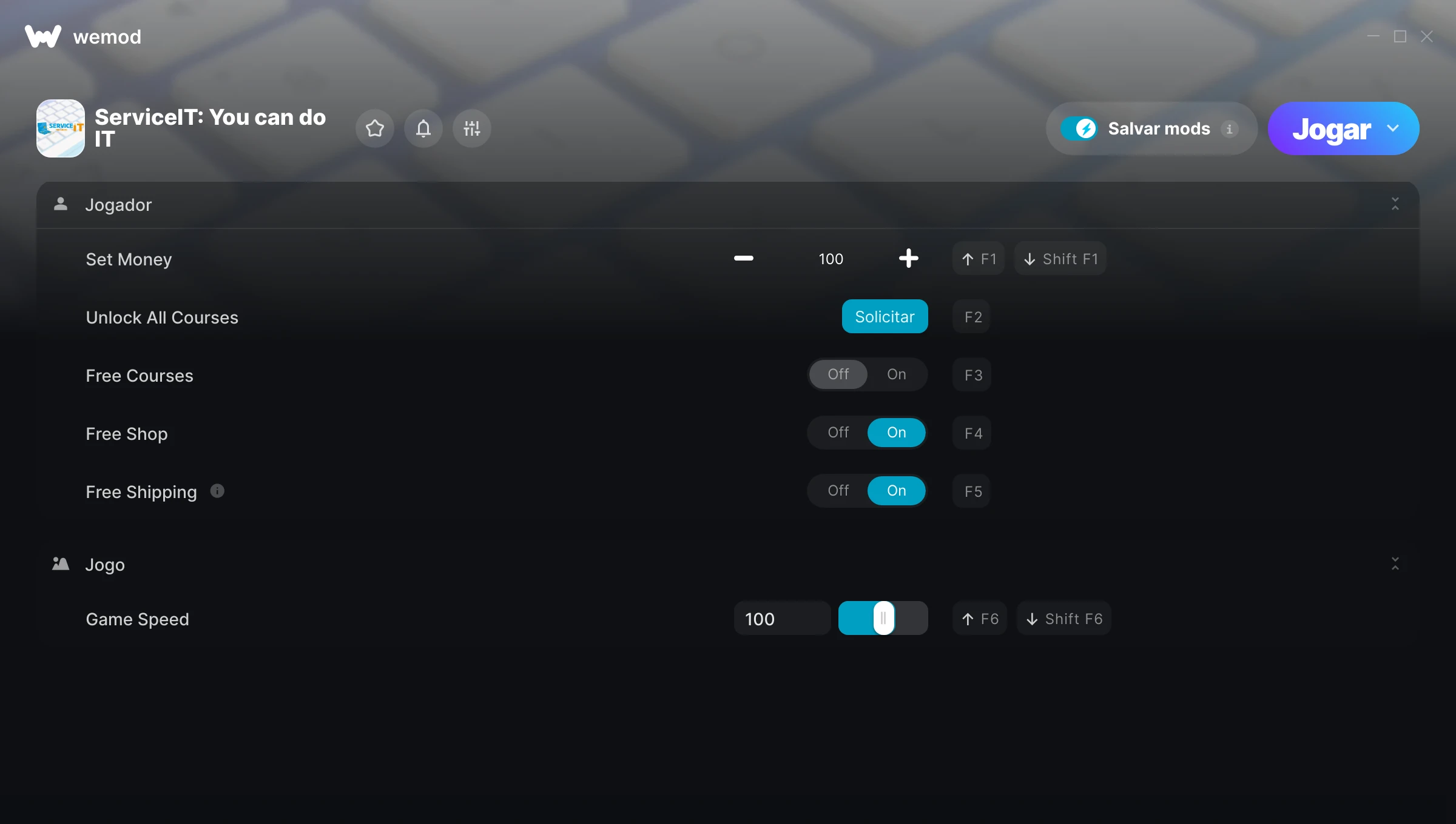 Como uso as trapaças em ServiceIT: You can do IT?O WeMod exibirá todos os jogos no seu PC com segurança. Abra um jogo da lista e simplesmente pressione Jogar. Depois que o jogo for carregado e você estiver no jogo, você poderá começar a ativar diferentes trapaças!Vai funcionar com a minha versão do jogo?O WeMod usa tecnologia avançada para detectar a versão do jogo que você está rodando e avisar se é suportada. Se não for, você ainda terá a opção de tentar assim mesmo ou solicitar uma atualização!