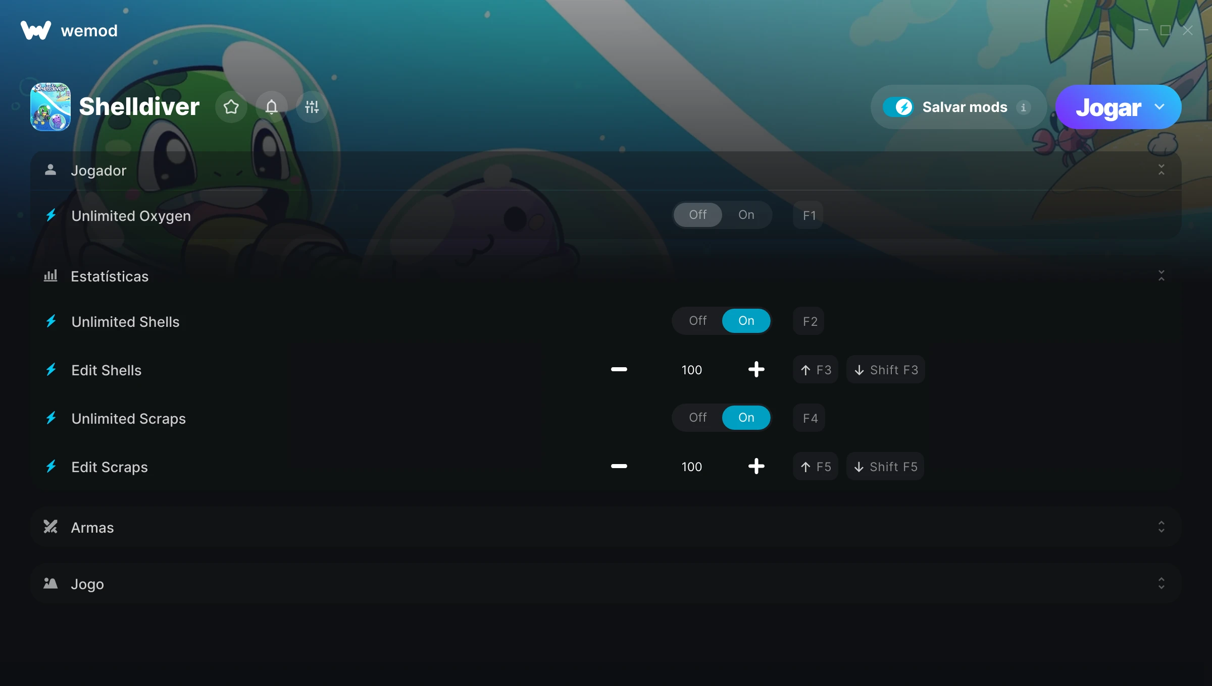 Como uso as trapaças em Shelldiver?O WeMod exibirá todos os jogos no seu PC com segurança. Abra um jogo da lista e simplesmente pressione Jogar. Depois que o jogo for carregado e você estiver no jogo, você poderá começar a ativar diferentes trapaças!Vai funcionar com a minha versão do jogo?O WeMod usa tecnologia avançada para detectar a versão do jogo que você está rodando e avisar se é suportada. Se não for, você ainda terá a opção de tentar assim mesmo ou solicitar uma atualização!