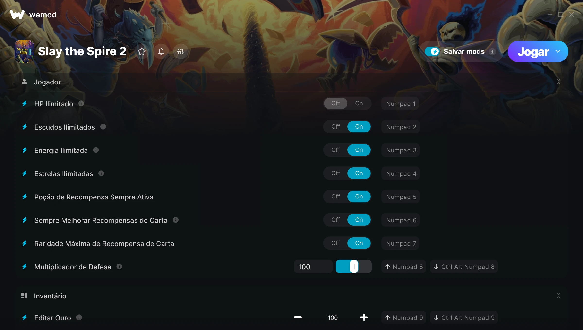 Como uso as trapaças em Slay the Spire 2?O WeMod exibirá todos os jogos no seu PC com segurança. Abra um jogo da lista e simplesmente pressione Jogar. Depois que o jogo for carregado e você estiver no jogo, você poderá começar a ativar diferentes trapaças!Vai funcionar com a minha versão do jogo?O WeMod usa tecnologia avançada para detectar a versão do jogo que você está rodando e avisar se é suportada. Se não for, você ainda terá a opção de tentar assim mesmo ou solicitar uma atualização!
