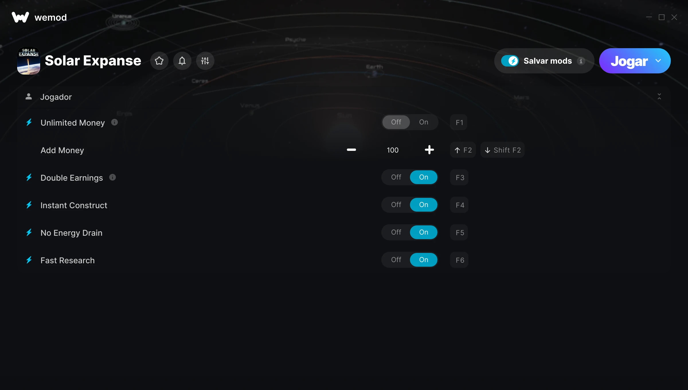 Como uso as trapaças em Solar Expanse?O WeMod exibirá todos os jogos no seu PC com segurança. Abra um jogo da lista e simplesmente pressione Jogar. Depois que o jogo for carregado e você estiver no jogo, você poderá começar a ativar diferentes trapaças!Vai funcionar com a minha versão do jogo?O WeMod usa tecnologia avançada para detectar a versão do jogo que você está rodando e avisar se é suportada. Se não for, você ainda terá a opção de tentar assim mesmo ou solicitar uma atualização!