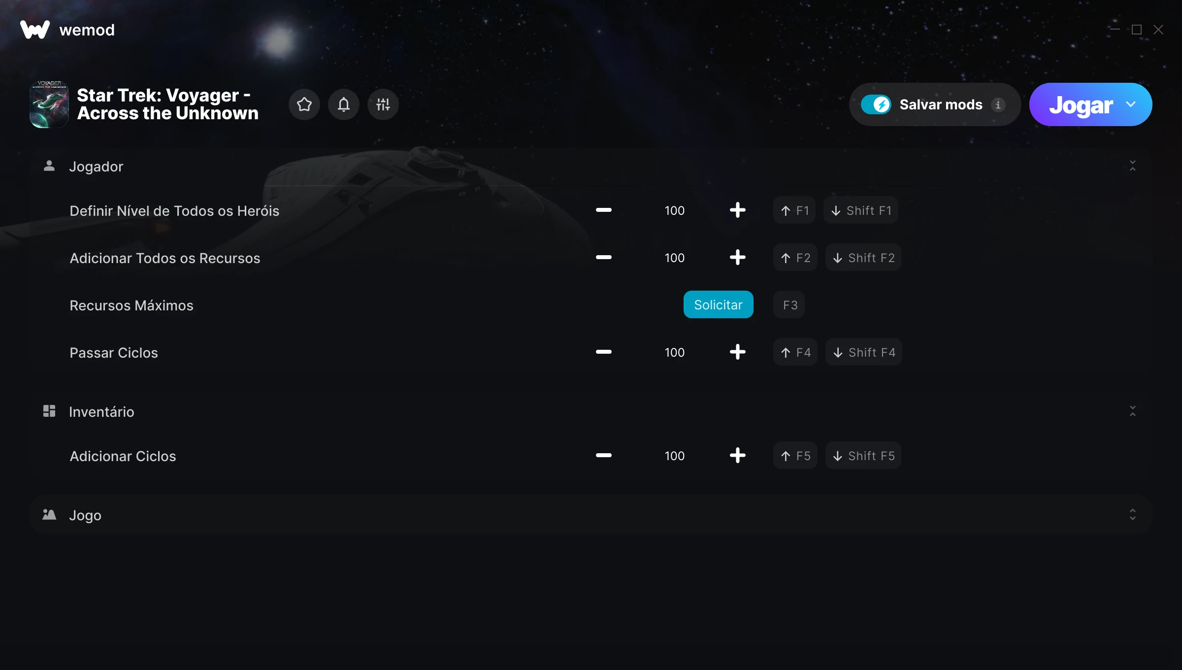 Como uso as trapaças em Star Trek: Voyager - Across the Unknown?O WeMod exibirá todos os jogos no seu PC com segurança. Abra um jogo da lista e simplesmente pressione Jogar. Depois que o jogo for carregado e você estiver no jogo, você poderá começar a ativar diferentes trapaças!Vai funcionar com a minha versão do jogo?O WeMod usa tecnologia avançada para detectar a versão do jogo que você está rodando e avisar se é suportada. Se não for, você ainda terá a opção de tentar assim mesmo ou solicitar uma atualização!