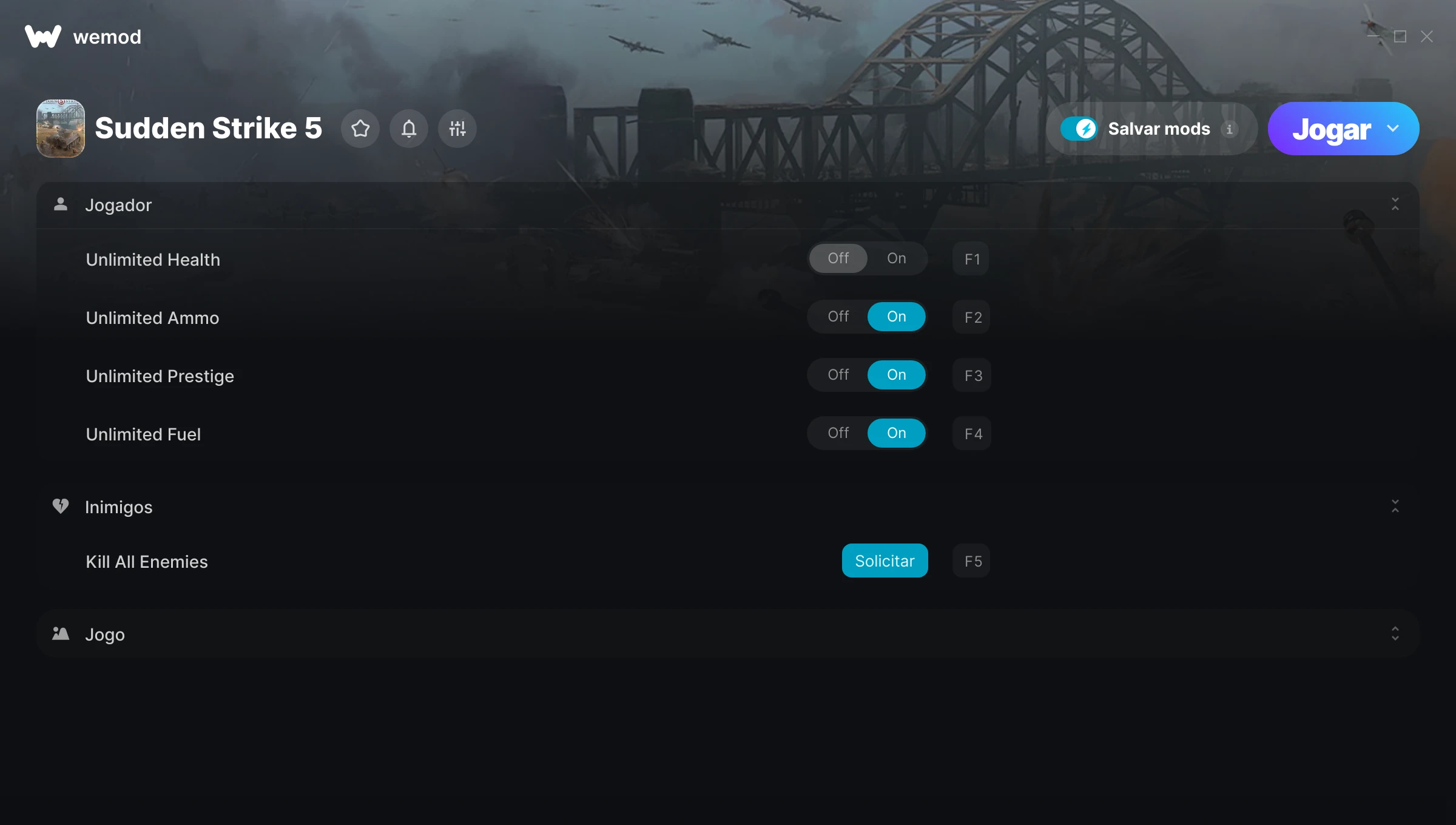 Como uso as trapaças em Sudden Strike 5?O WeMod exibirá todos os jogos no seu PC com segurança. Abra um jogo da lista e simplesmente pressione Jogar. Depois que o jogo for carregado e você estiver no jogo, você poderá começar a ativar diferentes trapaças!Vai funcionar com a minha versão do jogo?O WeMod usa tecnologia avançada para detectar a versão do jogo que você está rodando e avisar se é suportada. Se não for, você ainda terá a opção de tentar assim mesmo ou solicitar uma atualização!