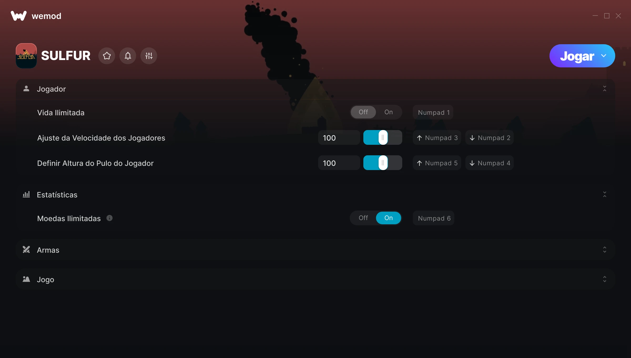 Como uso as trapaças em SULFUR?O WeMod exibirá todos os jogos no seu PC com segurança. Abra um jogo da lista e simplesmente pressione Jogar. Depois que o jogo for carregado e você estiver no jogo, você poderá começar a ativar diferentes trapaças!Vai funcionar com a minha versão do jogo?O WeMod usa tecnologia avançada para detectar a versão do jogo que você está rodando e avisar se é suportada. Se não for, você ainda terá a opção de tentar assim mesmo ou solicitar uma atualização!