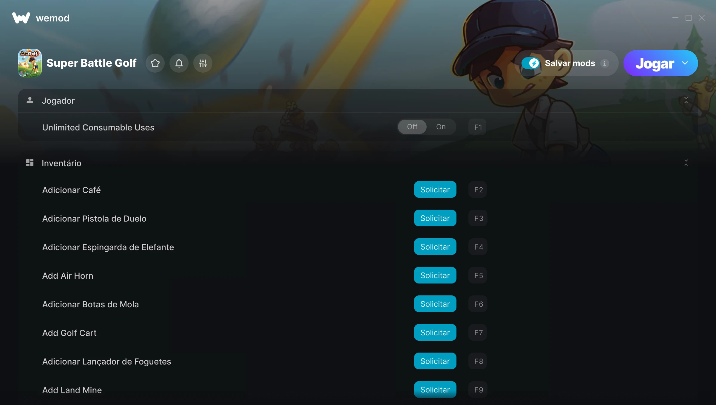Como uso as trapaças em Super Battle Golf?O WeMod exibirá todos os jogos no seu PC com segurança. Abra um jogo da lista e simplesmente pressione Jogar. Depois que o jogo for carregado e você estiver no jogo, você poderá começar a ativar diferentes trapaças!Vai funcionar com a minha versão do jogo?O WeMod usa tecnologia avançada para detectar a versão do jogo que você está rodando e avisar se é suportada. Se não for, você ainda terá a opção de tentar assim mesmo ou solicitar uma atualização!