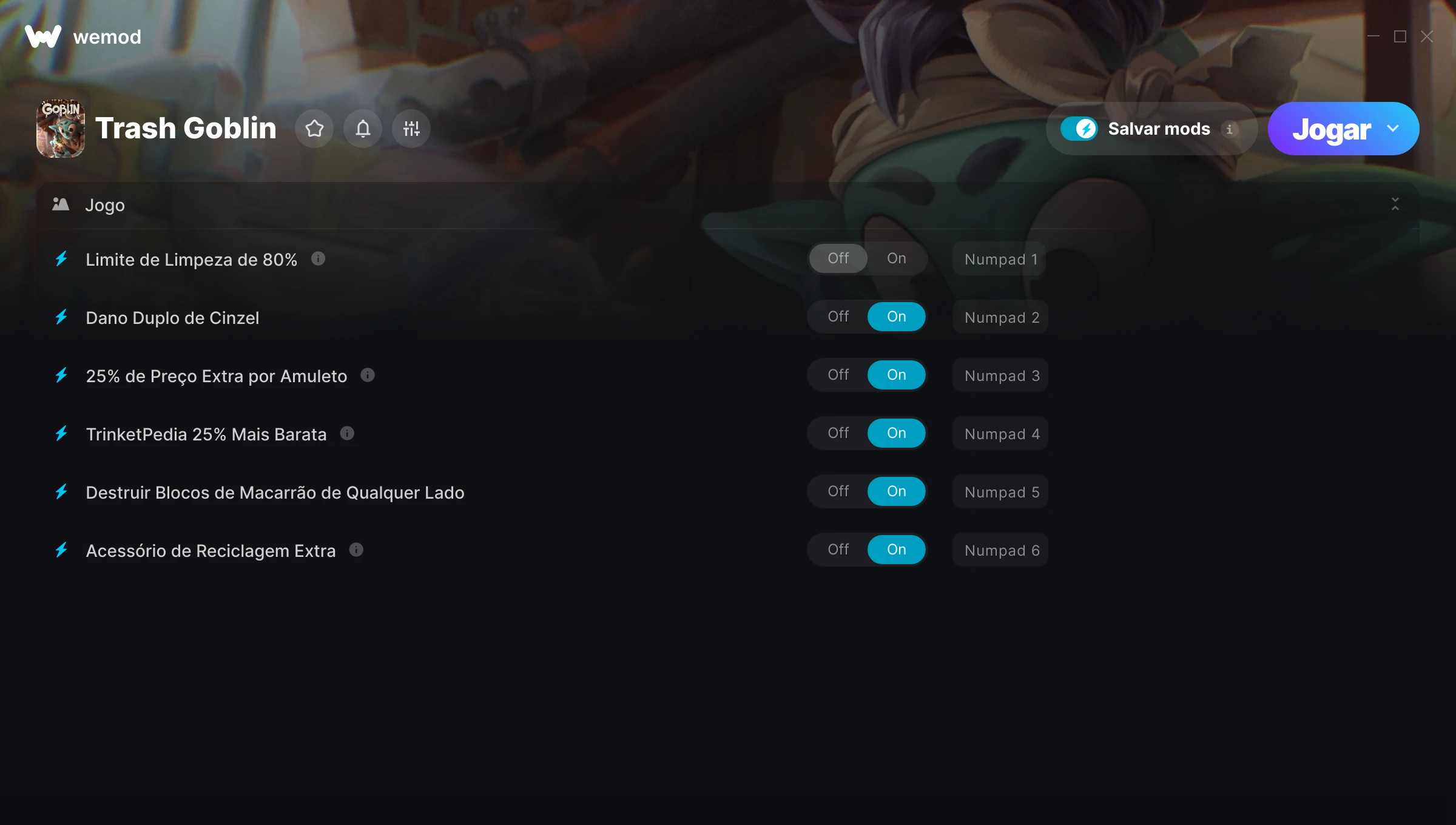 Como uso as trapaças em Trash Goblin?O WeMod exibirá todos os jogos no seu PC com segurança. Abra um jogo da lista e simplesmente pressione Jogar. Depois que o jogo for carregado e você estiver no jogo, você poderá começar a ativar diferentes trapaças!Vai funcionar com a minha versão do jogo?O WeMod usa tecnologia avançada para detectar a versão do jogo que você está rodando e avisar se é suportada. Se não for, você ainda terá a opção de tentar assim mesmo ou solicitar uma atualização!