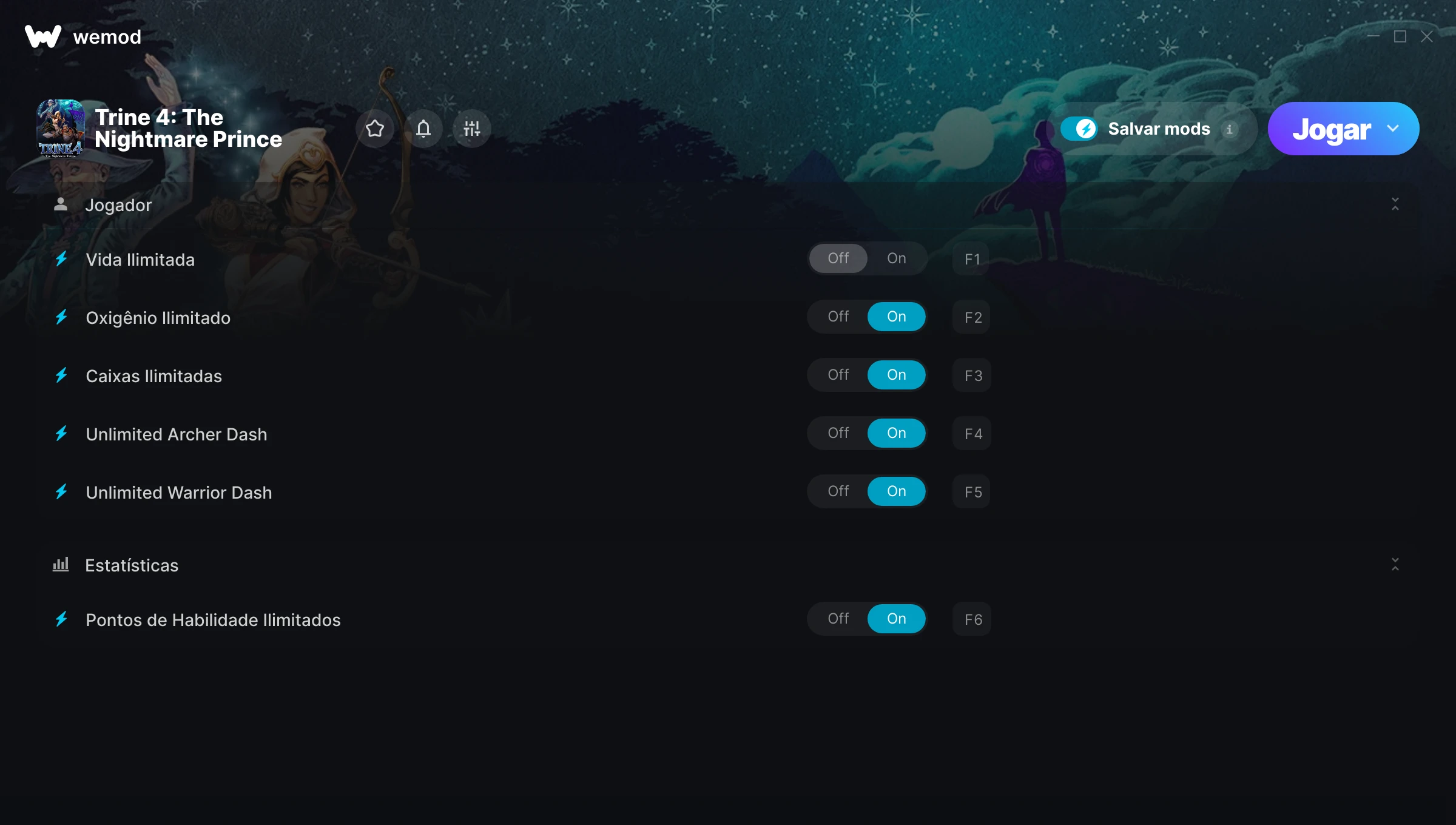 Como uso as trapaças em Trine 4: The Nightmare Prince?O WeMod exibirá todos os jogos no seu PC com segurança. Abra um jogo da lista e simplesmente pressione Jogar. Depois que o jogo for carregado e você estiver no jogo, você poderá começar a ativar diferentes trapaças!Vai funcionar com a minha versão do jogo?O WeMod usa tecnologia avançada para detectar a versão do jogo que você está rodando e avisar se é suportada. Se não for, você ainda terá a opção de tentar assim mesmo ou solicitar uma atualização!