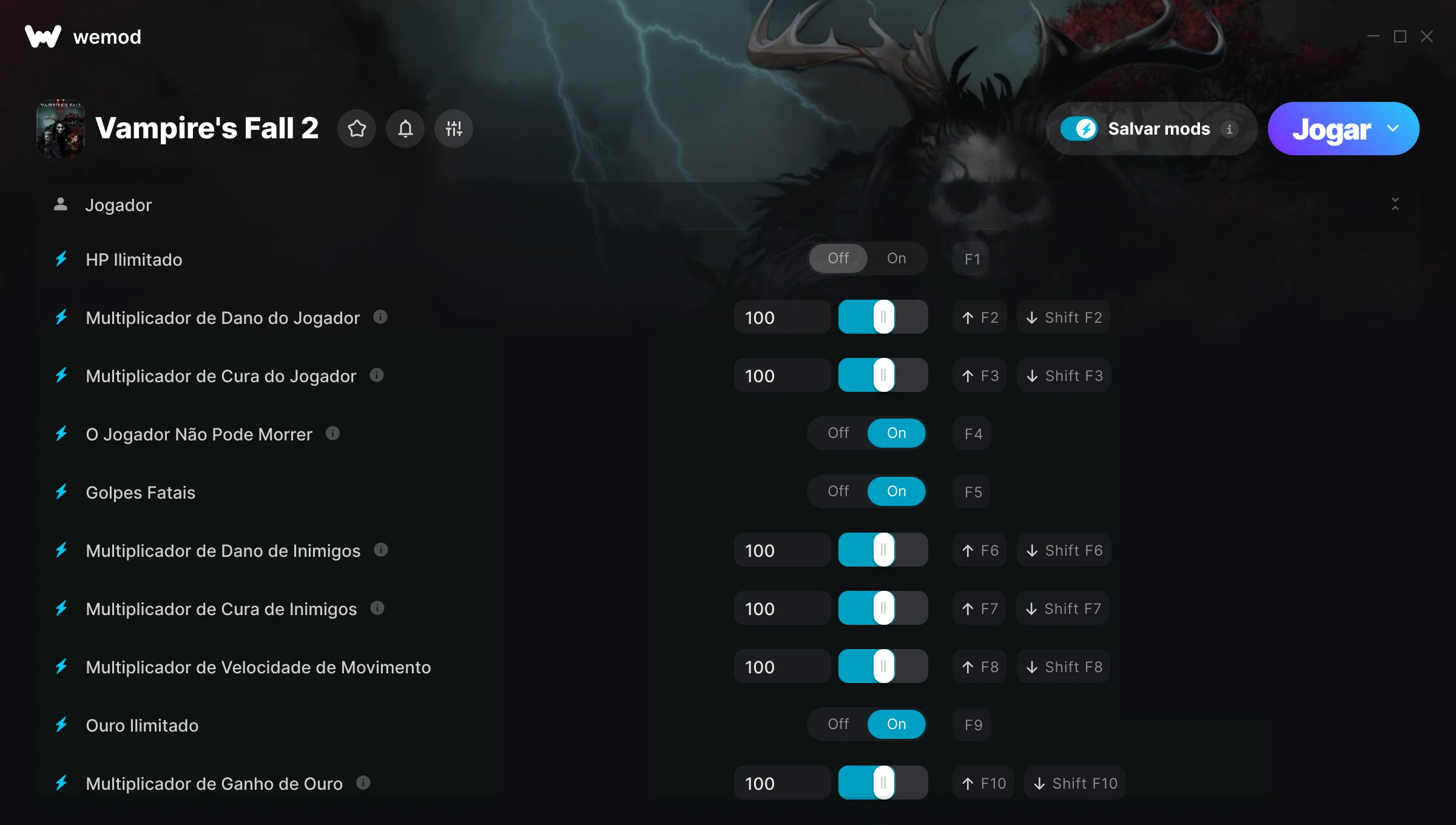 Como uso as trapaças em Vampire's Fall 2?O WeMod exibirá todos os jogos no seu PC com segurança. Abra um jogo da lista e simplesmente pressione Jogar. Depois que o jogo for carregado e você estiver no jogo, você poderá começar a ativar diferentes trapaças!Vai funcionar com a minha versão do jogo?O WeMod usa tecnologia avançada para detectar a versão do jogo que você está rodando e avisar se é suportada. Se não for, você ainda terá a opção de tentar assim mesmo ou solicitar uma atualização!