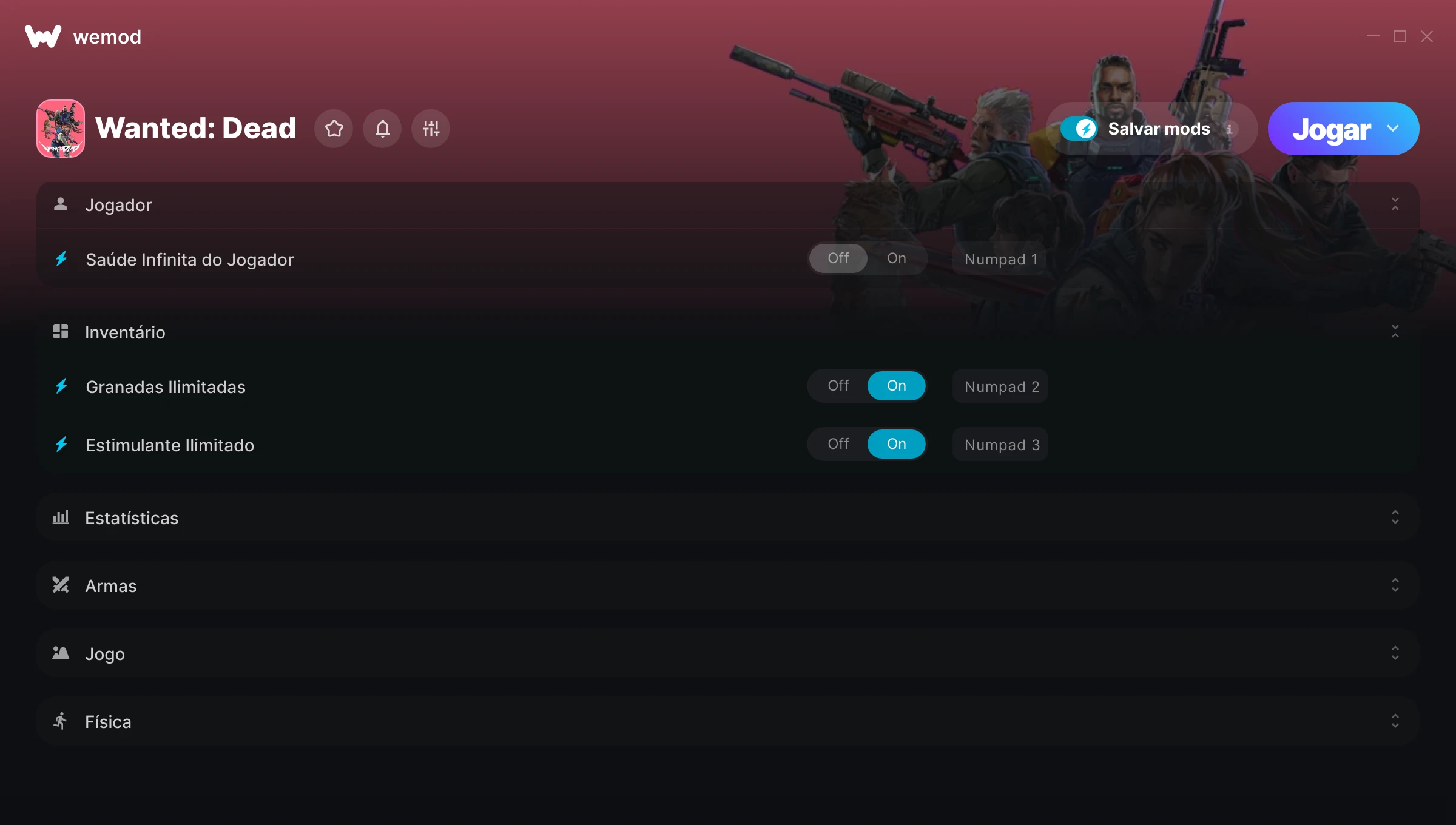 Como uso as trapaças em Wanted: Dead?O WeMod exibirá todos os jogos no seu PC com segurança. Abra um jogo da lista e simplesmente pressione Jogar. Depois que o jogo for carregado e você estiver no jogo, você poderá começar a ativar diferentes trapaças!Vai funcionar com a minha versão do jogo?O WeMod usa tecnologia avançada para detectar a versão do jogo que você está rodando e avisar se é suportada. Se não for, você ainda terá a opção de tentar assim mesmo ou solicitar uma atualização!