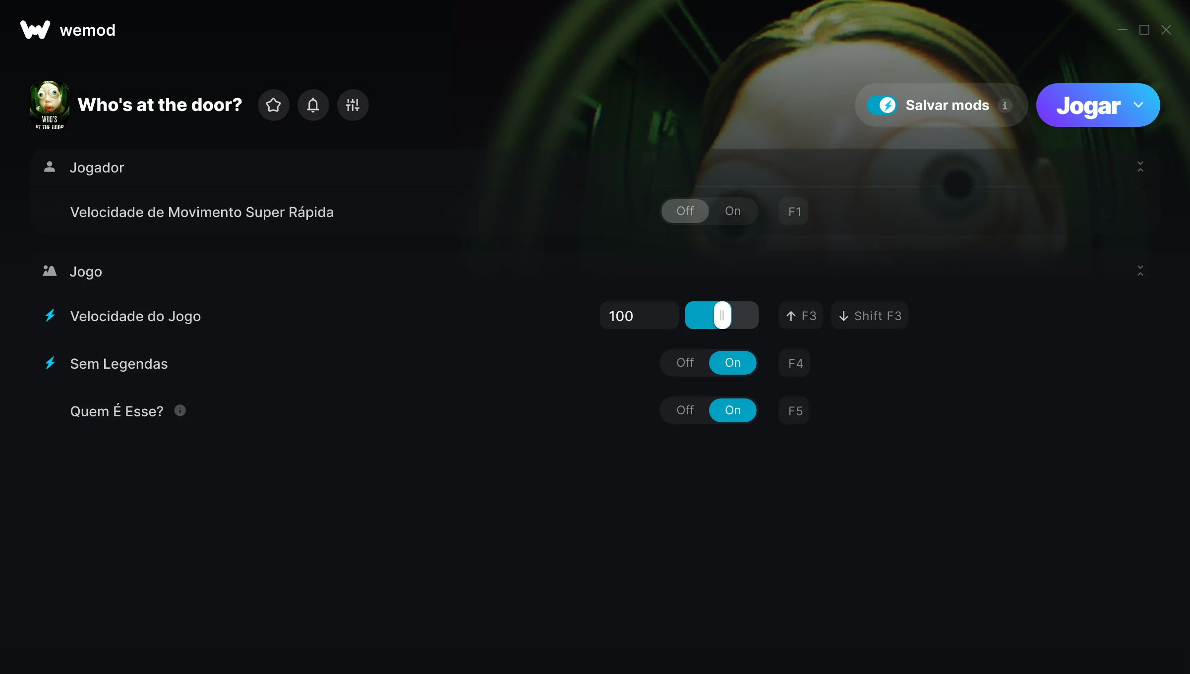 Como uso as trapaças em Who's at the door??O WeMod exibirá todos os jogos no seu PC com segurança. Abra um jogo da lista e simplesmente pressione Jogar. Depois que o jogo for carregado e você estiver no jogo, você poderá começar a ativar diferentes trapaças!Vai funcionar com a minha versão do jogo?O WeMod usa tecnologia avançada para detectar a versão do jogo que você está rodando e avisar se é suportada. Se não for, você ainda terá a opção de tentar assim mesmo ou solicitar uma atualização!