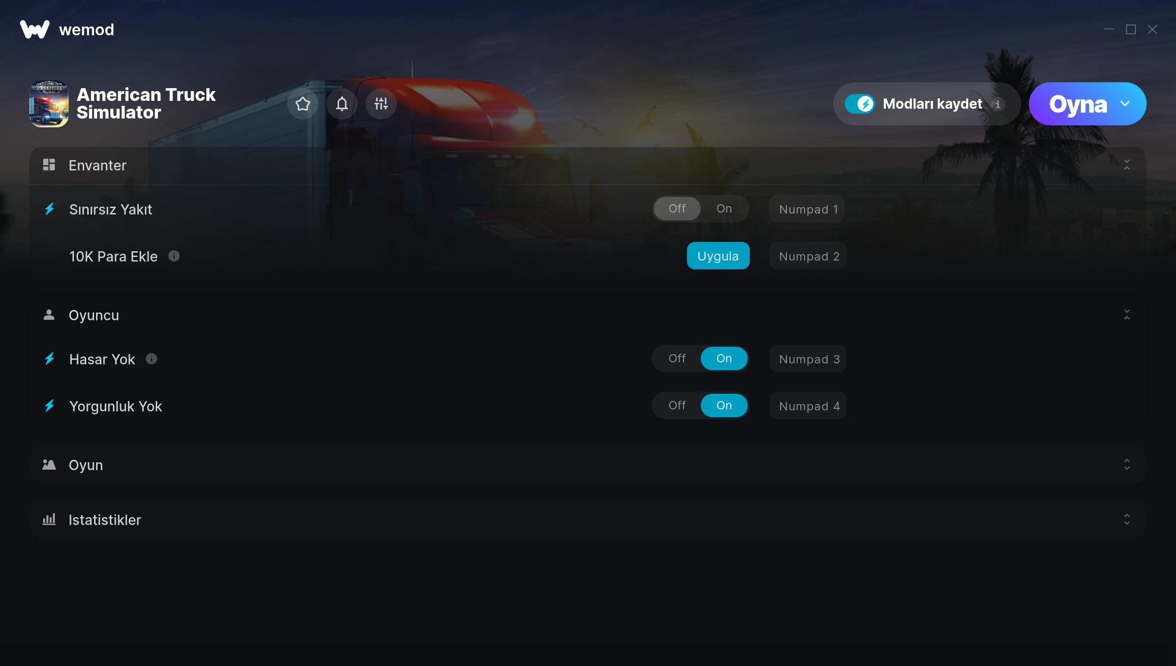 Playing American Truck Simulator with We Mod, has been such a game changer. I use a 1986 Chevrolet K-10 (Mod) and it burns through gas way to quickly. With the unlimited fuel feature, it makes it a whole lot more fun to play. When i'm driving my Peterbilt 379, the game likes to put random damage on my truck, when I have not crashed it. With no damage, this is not a problem and I don't have to put un neccessary money into repairing something that is not damaged. Huge thanks to the developer.