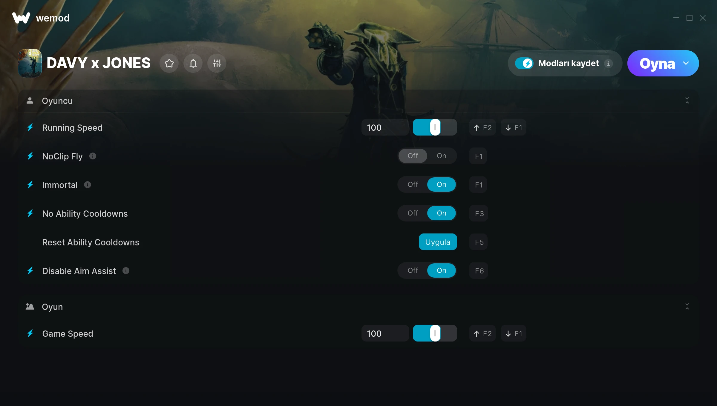 85MB Windows ...veya uygulamayı indirmek için bizi bilgisayarından ziyaret et Koşma Hızı Edinin, NoClip Uçma & 5 diğer mod for DAVY x JONES with WeMod