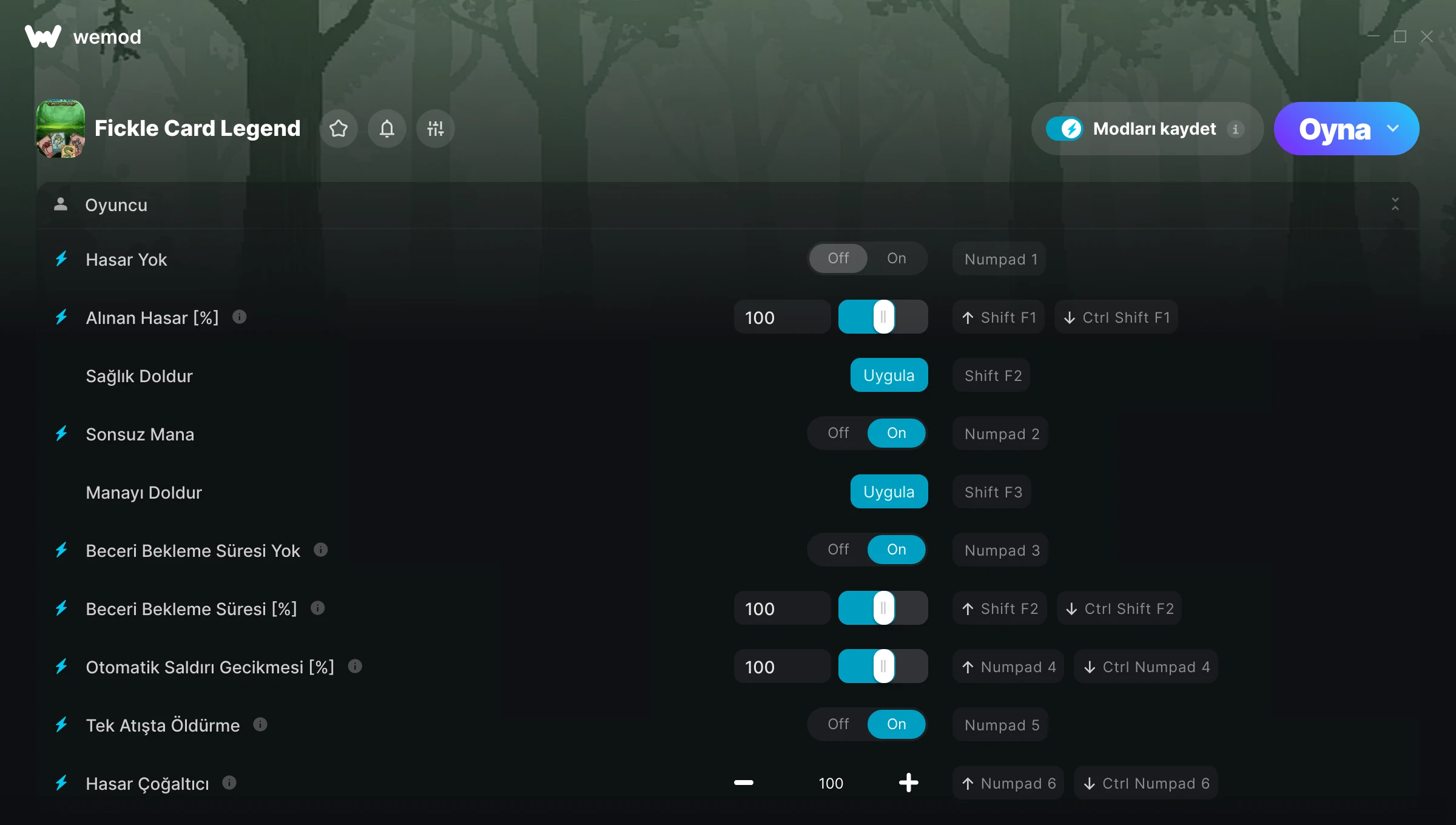 85MB Windows ...veya uygulamayı indirmek için bizi bilgisayarından ziyaret et Hasar Yok Edinin, Alınan Hasar [%] & 14 diğer mod for Fickle Card Legend with WeMod