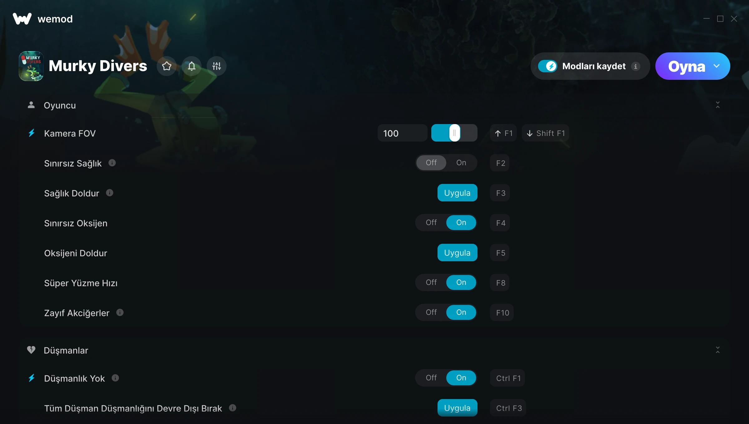 85MB Windows ...veya uygulamayı indirmek için bizi bilgisayarından ziyaret et Kamera FOV Edinin, Sınırsız Sağlık & 15 diğer mod for Murky Divers with WeMod