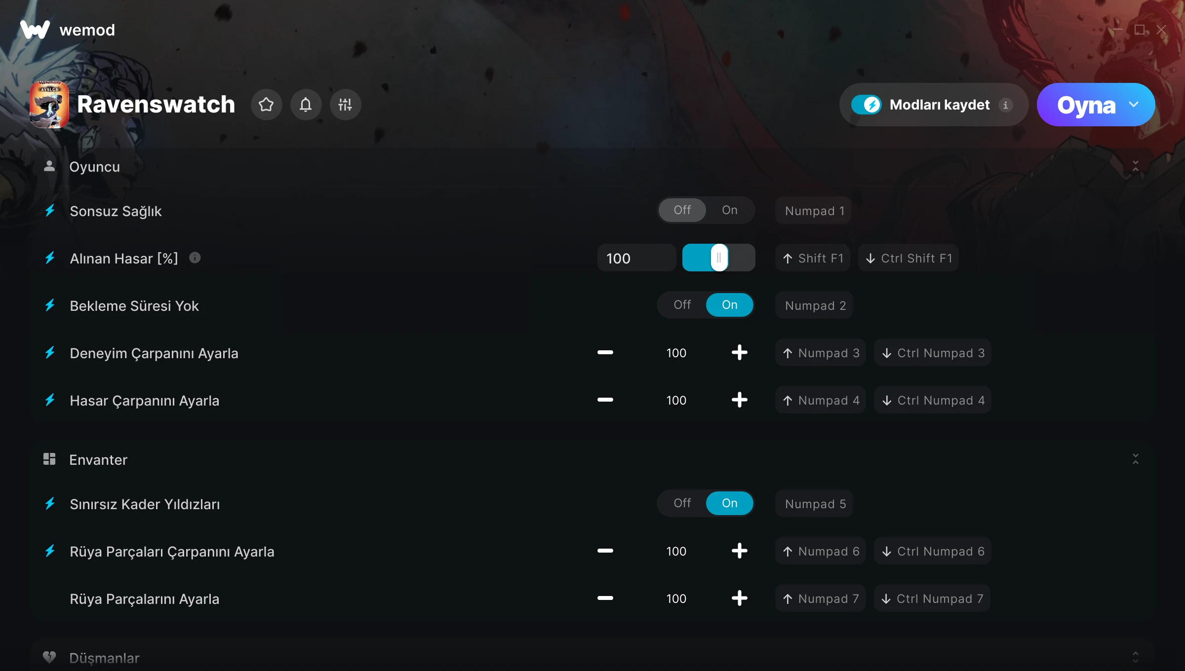 85MB Windows ...veya uygulamayı indirmek için bizi bilgisayarından ziyaret et Sonsuz Sağlık Edinin, Alınan Hasar [%] & 8 diğer mod for Ravenswatch with WeMod