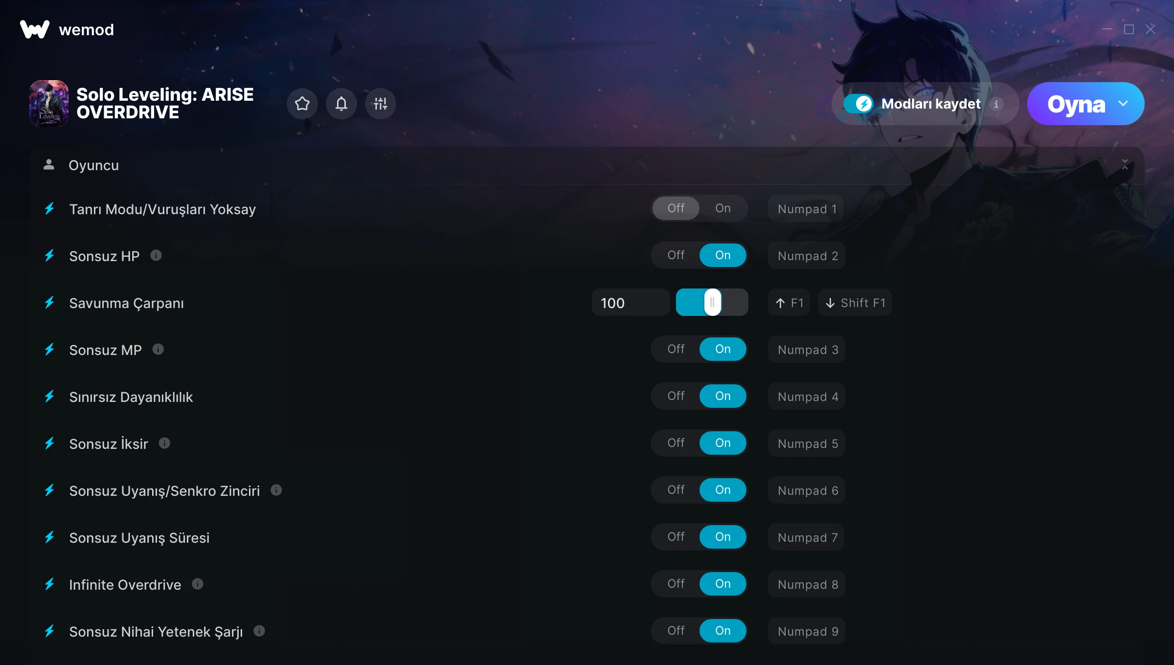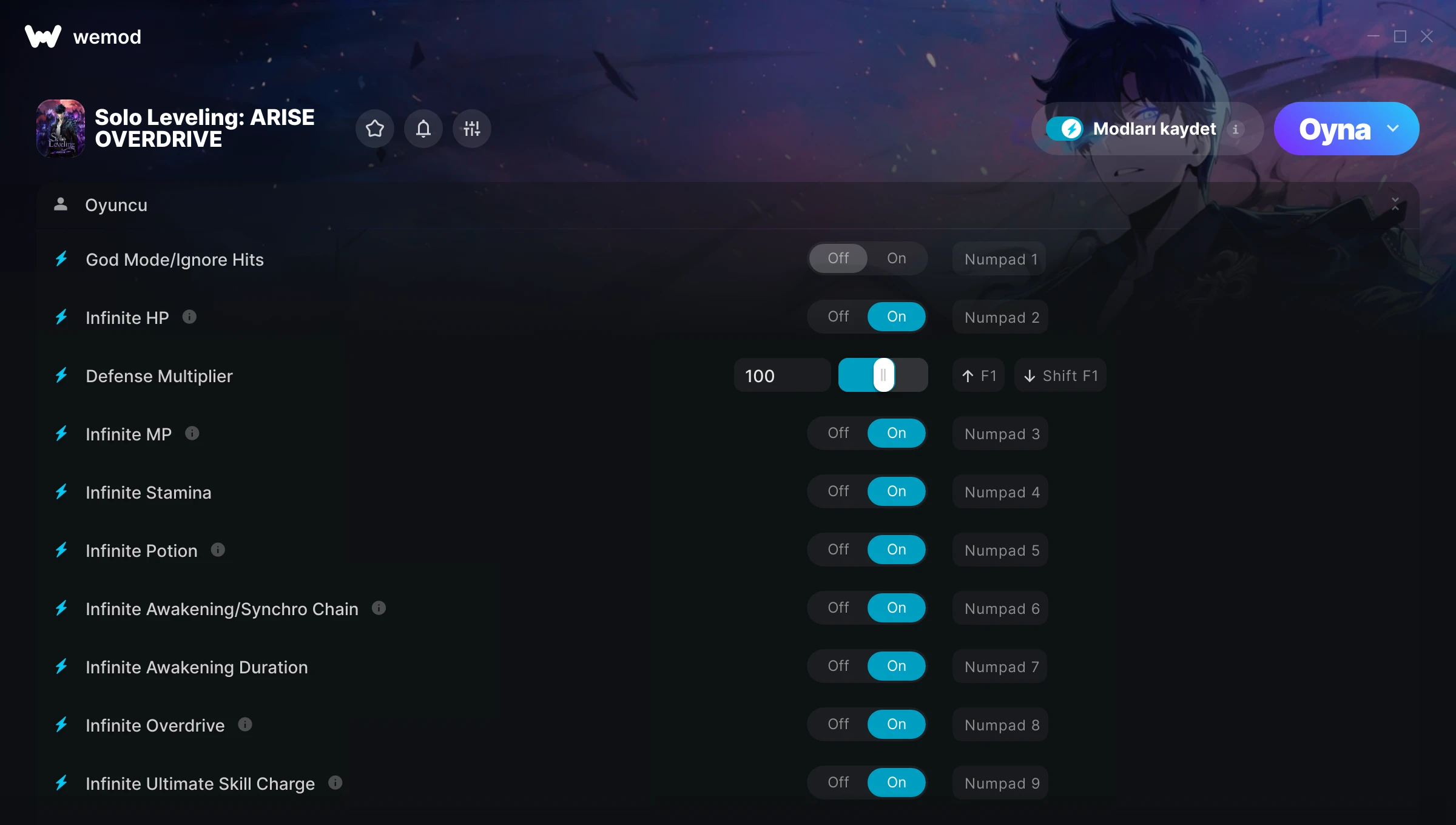 85MB Windows ...veya uygulamayı indirmek için bizi bilgisayarından ziyaret et Tanrı Modu/Vuruşları Yoksay Edinin, Sonsuz HP & 17 diğer mod for Solo Leveling: ARISE OVERDRIVE with WeMod