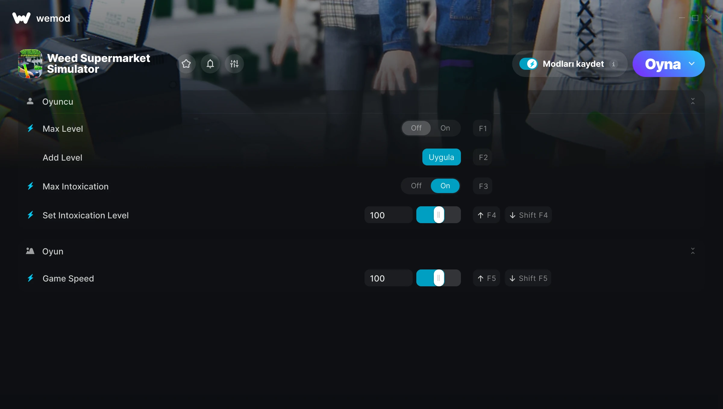 85MB Windows ...veya uygulamayı indirmek için bizi bilgisayarından ziyaret et Maksimum Seviye Edinin, EXP Ekle & 4 diğer mod for Weed Supermarket Simulator with WeMod