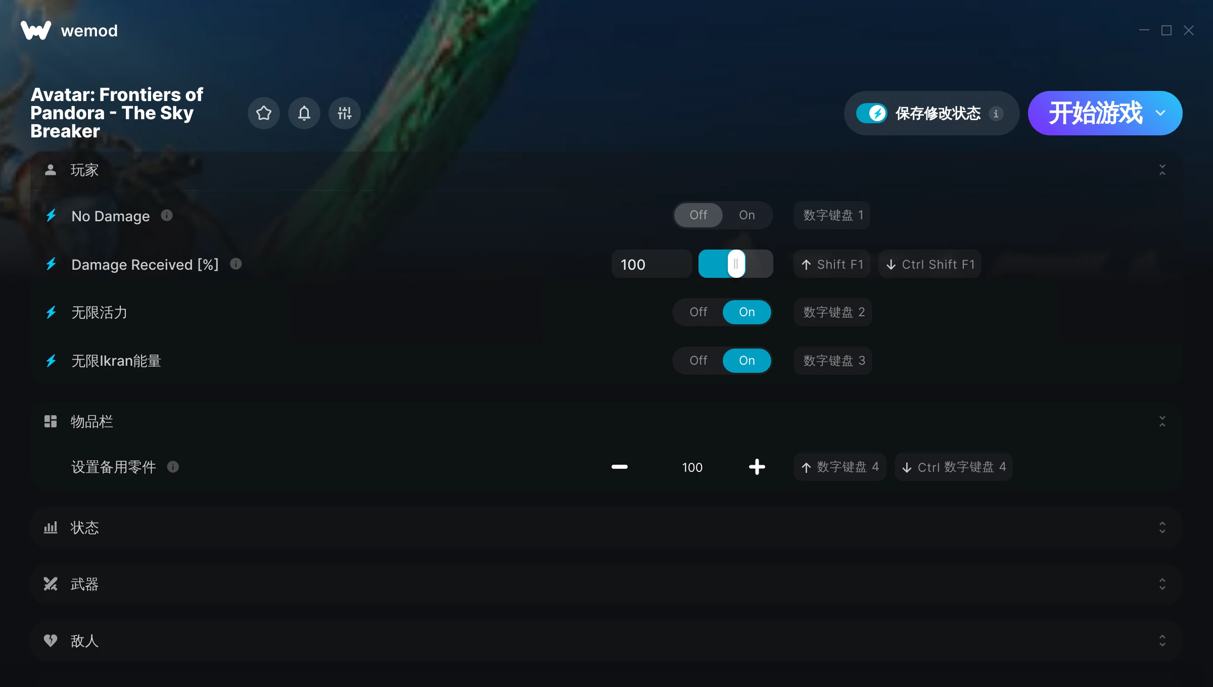 如何在 Avatar: Frontiers of Pandora - The Sky Breaker 中使用修改器?WeMod 会安全地扫描并显示你的 PC 上已安装的所有游戏。只需从列表中选择一款游戏并点击“开始游戏”,即可快速启动游戏。当游戏完成加载并进入游戏画面后,你就可以开启各种修改了!这些修改适用于我的游戏版本吗?WeMod 还能使用先进技术自动检测你的游戏版本,并告知你该游戏是否支持修改。如果暂无修改,你可以选择直接进入游戏或提交制作申请!