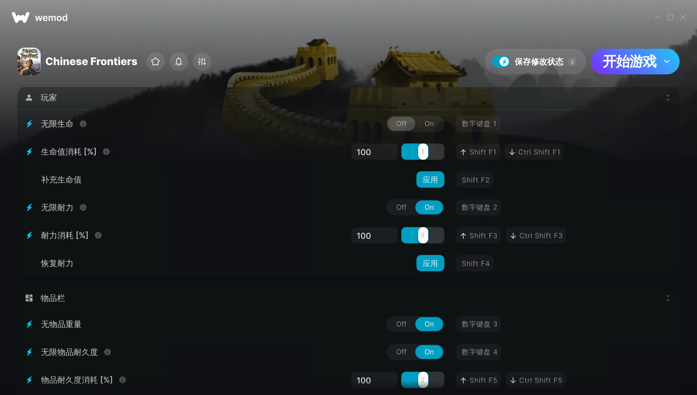 如何在 Chinese Frontiers 中使用修改器?WeMod 会安全地扫描并显示你的 PC 上已安装的所有游戏。只需从列表中选择一款游戏并点击“开始游戏”,即可快速启动游戏。当游戏完成加载并进入游戏画面后,你就可以开启各种修改了!这些修改适用于我的游戏版本吗?WeMod 还能使用先进技术自动检测你的游戏版本,并告知你该游戏是否支持修改。如果暂无修改,你可以选择直接进入游戏或提交制作申请!