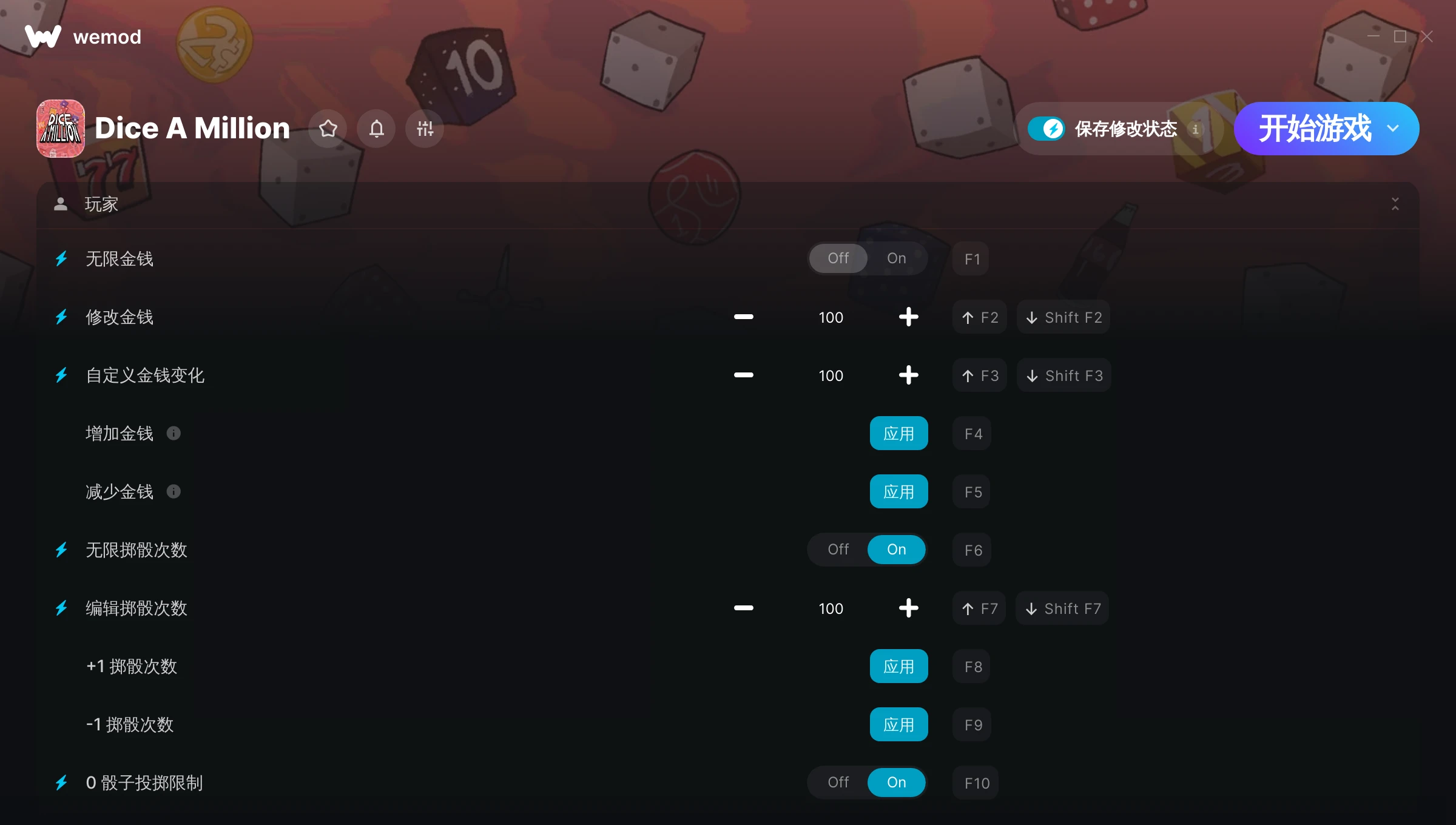 如何在 Dice A Million 中使用修改器?WeMod 会安全地扫描并显示你的 PC 上已安装的所有游戏。只需从列表中选择一款游戏并点击“开始游戏”,即可快速启动游戏。当游戏完成加载并进入游戏画面后,你就可以开启各种修改了!这些修改适用于我的游戏版本吗?WeMod 还能使用先进技术自动检测你的游戏版本,并告知你该游戏是否支持修改。如果暂无修改,你可以选择直接进入游戏或提交制作申请!