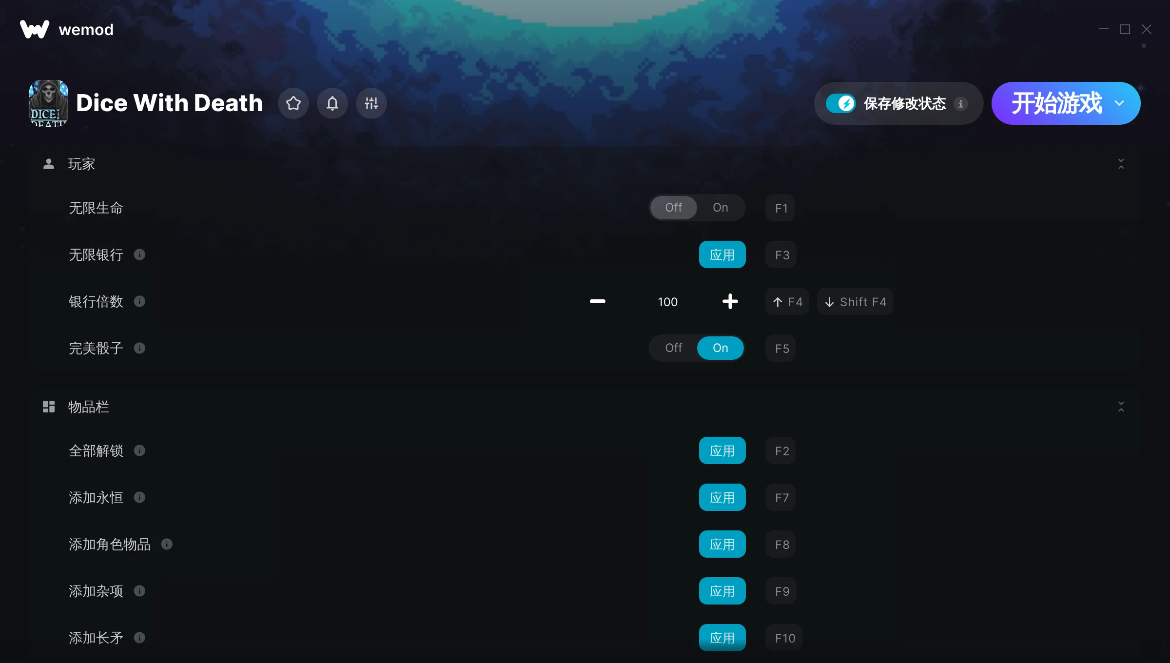 如何在 Dice With Death 中使用修改器?WeMod 会安全地扫描并显示你的 PC 上已安装的所有游戏。只需从列表中选择一款游戏并点击“开始游戏”,即可快速启动游戏。当游戏完成加载并进入游戏画面后,你就可以开启各种修改了!这些修改适用于我的游戏版本吗?WeMod 还能使用先进技术自动检测你的游戏版本,并告知你该游戏是否支持修改。如果暂无修改,你可以选择直接进入游戏或提交制作申请!