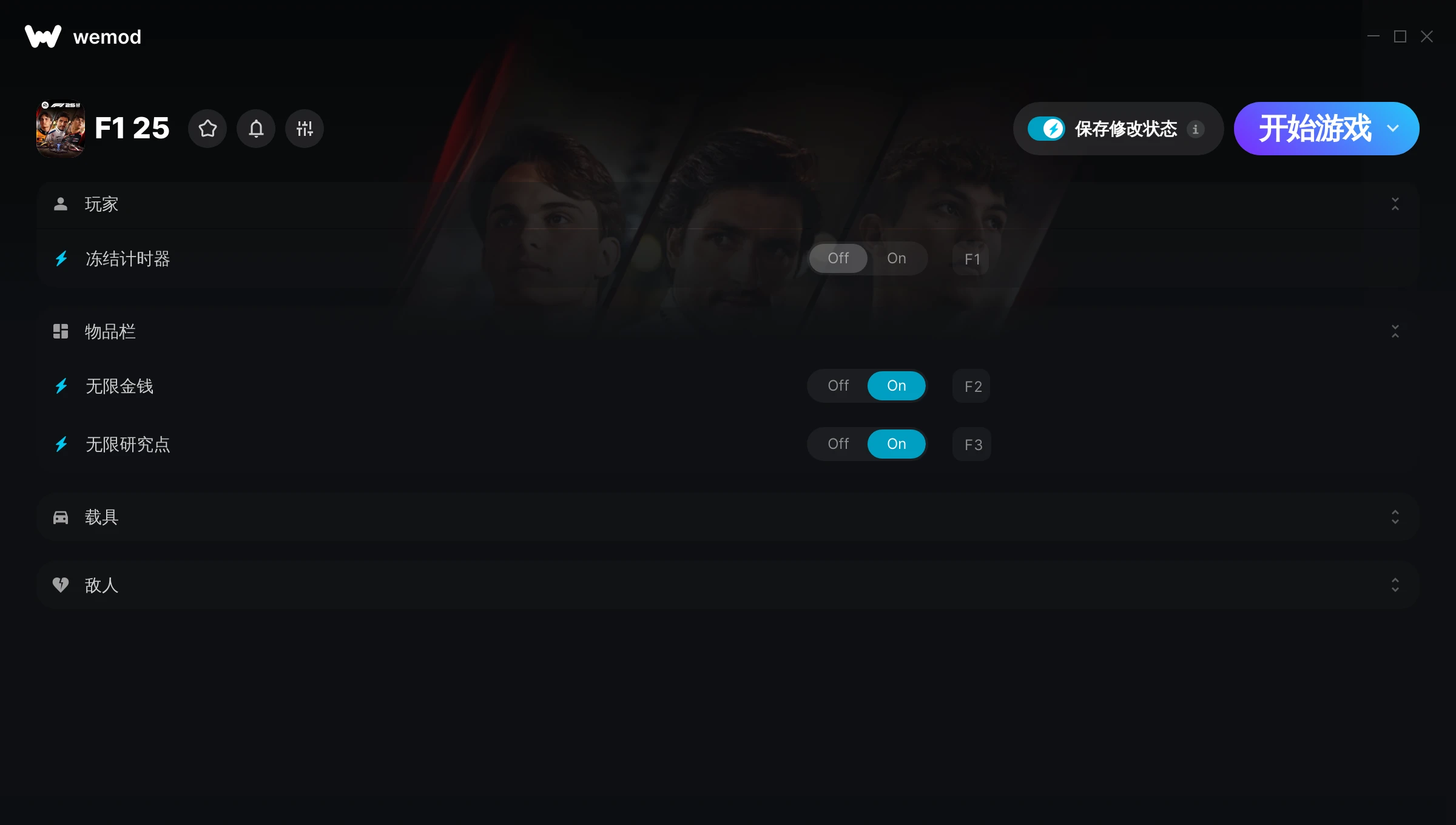如何在 F1 25 中使用修改器?WeMod 会安全地扫描并显示你的 PC 上已安装的所有游戏。只需从列表中选择一款游戏并点击“开始游戏”,即可快速启动游戏。当游戏完成加载并进入游戏画面后,你就可以开启各种修改了!这些修改适用于我的游戏版本吗?WeMod 还能使用先进技术自动检测你的游戏版本,并告知你该游戏是否支持修改。如果暂无修改,你可以选择直接进入游戏或提交制作申请!