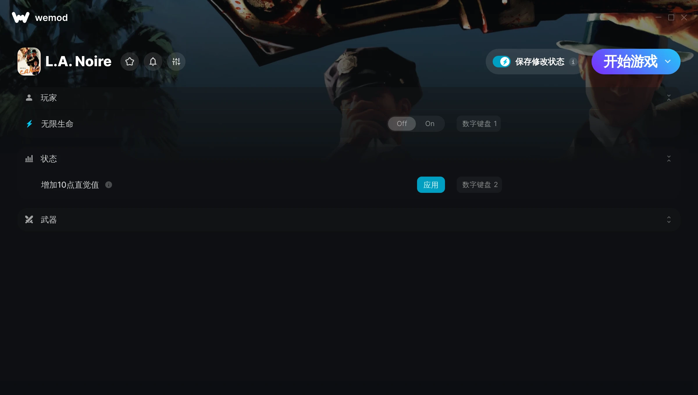85MB Windows ...或者在 PC 上访问我们的官网并下载桌面应用 下载无限生命, 增加10点直觉值 & 其他 2 项修改 for L.A. Noire with WeMod