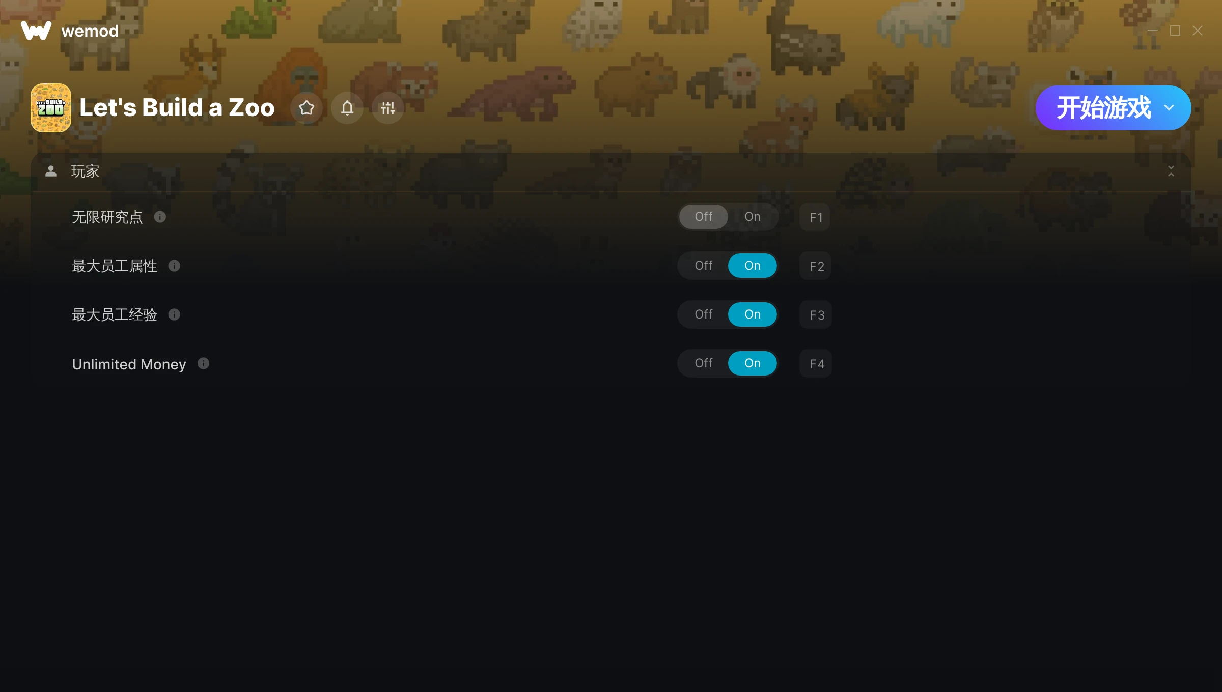如何在 Let's Build a Zoo 中使用修改器?WeMod 会安全地扫描并显示你的 PC 上已安装的所有游戏。只需从列表中选择一款游戏并点击“开始游戏”,即可快速启动游戏。当游戏完成加载并进入游戏画面后,你就可以开启各种修改了!这些修改适用于我的游戏版本吗?WeMod 还能使用先进技术自动检测你的游戏版本,并告知你该游戏是否支持修改。如果暂无修改,你可以选择直接进入游戏或提交制作申请!