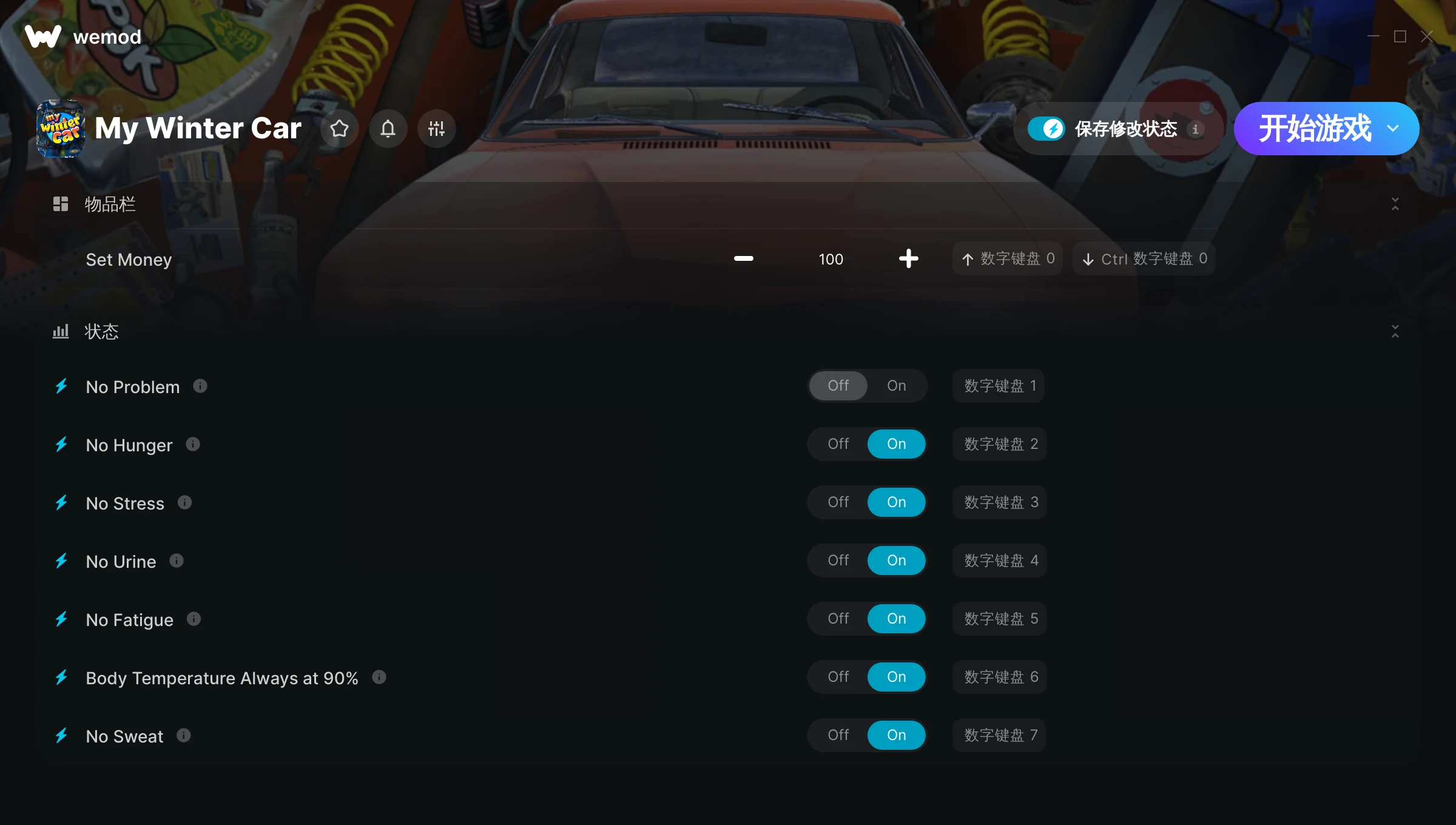 如何在 My Winter Car 中使用修改器?WeMod 会安全地扫描并显示你的 PC 上已安装的所有游戏。只需从列表中选择一款游戏并点击“开始游戏”,即可快速启动游戏。当游戏完成加载并进入游戏画面后,你就可以开启各种修改了!这些修改适用于我的游戏版本吗?WeMod 还能使用先进技术自动检测你的游戏版本,并告知你该游戏是否支持修改。如果暂无修改,你可以选择直接进入游戏或提交制作申请!