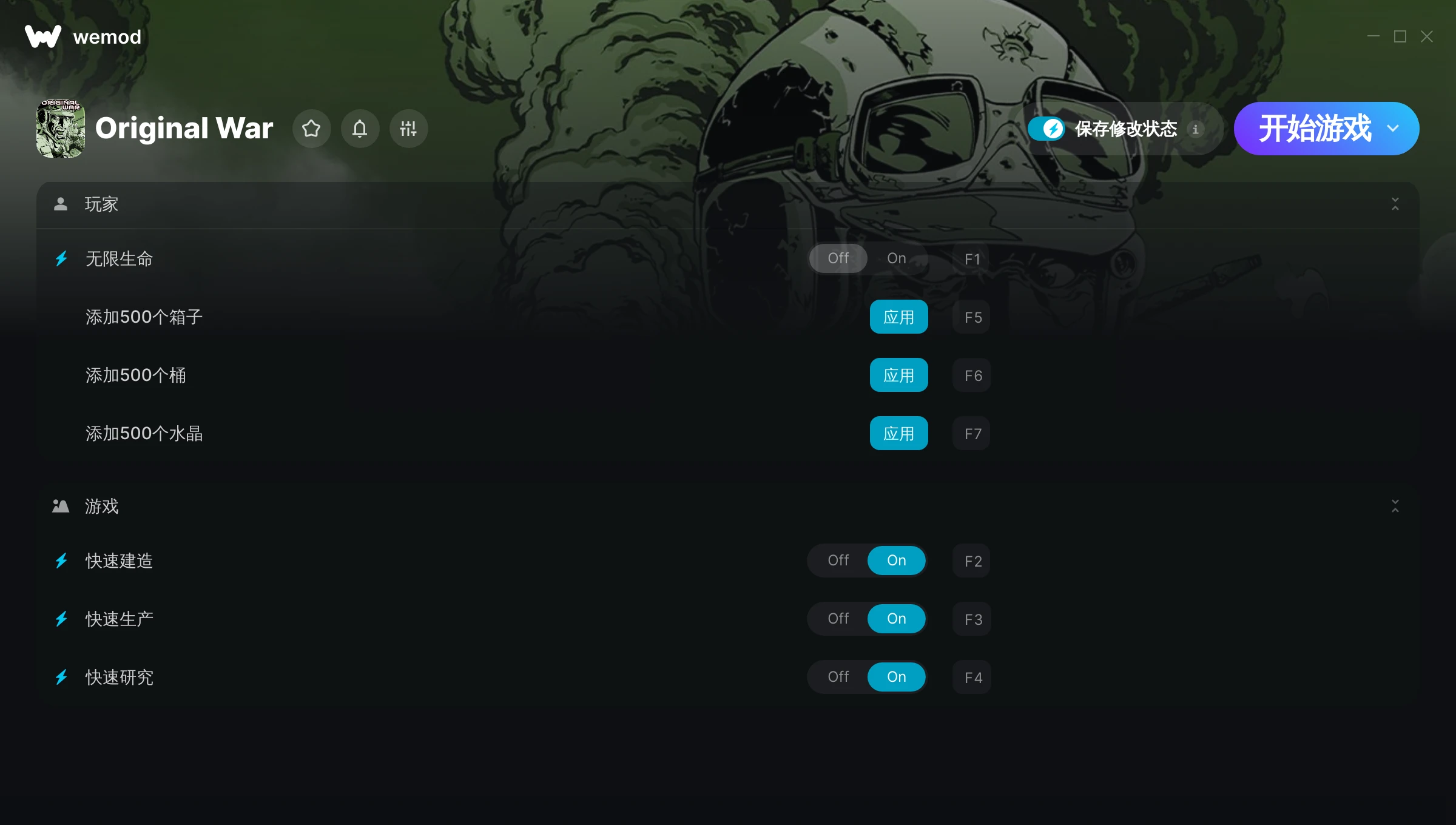 如何在 Original War 中使用修改器?WeMod 会安全地扫描并显示你的 PC 上已安装的所有游戏。只需从列表中选择一款游戏并点击“开始游戏”,即可快速启动游戏。当游戏完成加载并进入游戏画面后,你就可以开启各种修改了!这些修改适用于我的游戏版本吗?WeMod 还能使用先进技术自动检测你的游戏版本,并告知你该游戏是否支持修改。如果暂无修改,你可以选择直接进入游戏或提交制作申请!