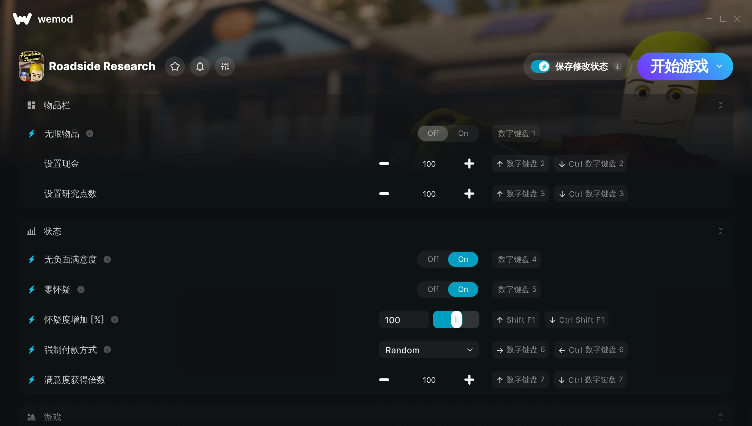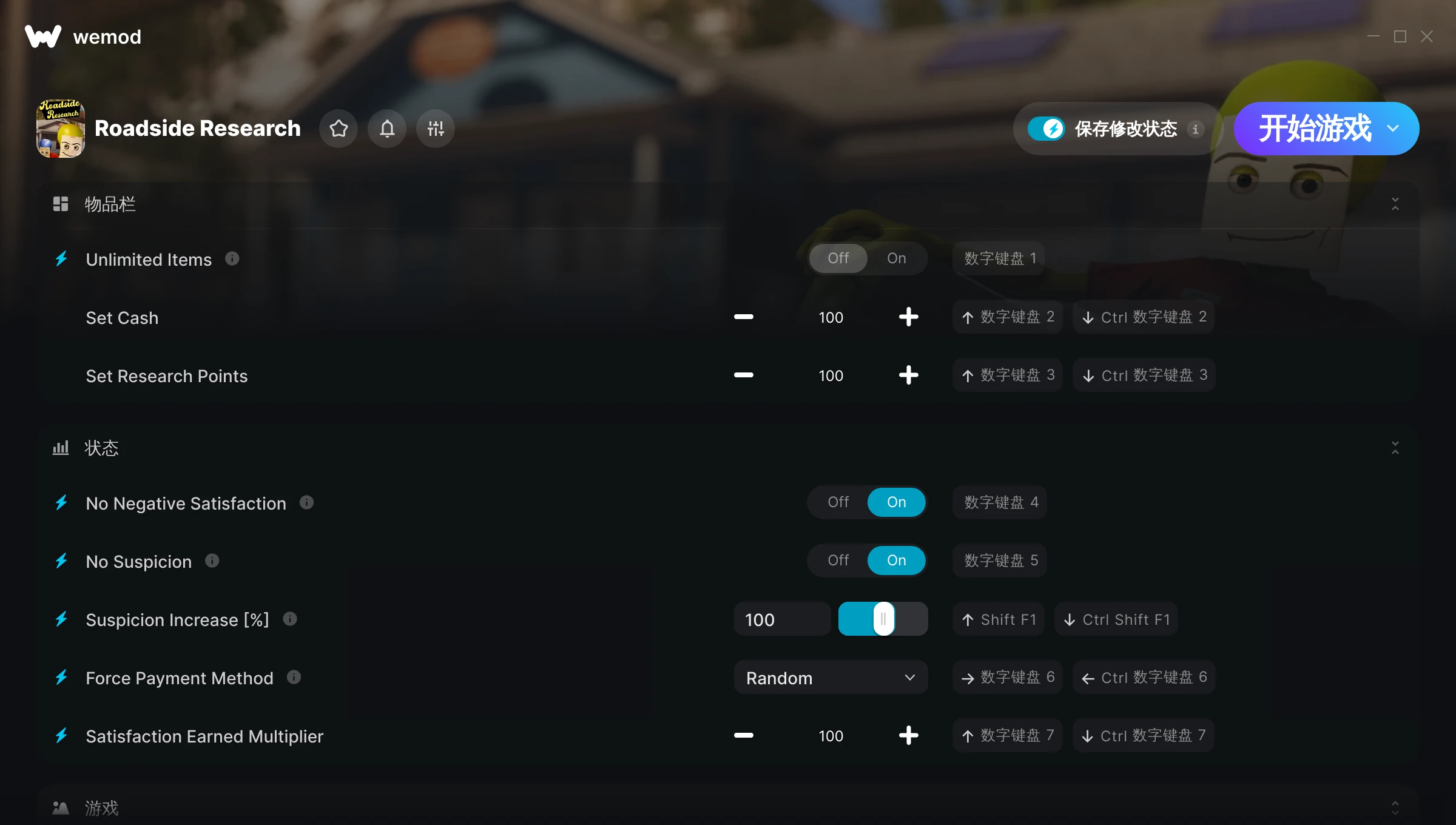 如何在 Roadside Research 中使用修改器?WeMod 会安全地扫描并显示你的 PC 上已安装的所有游戏。只需从列表中选择一款游戏并点击“开始游戏”,即可快速启动游戏。当游戏完成加载并进入游戏画面后,你就可以开启各种修改了!这些修改适用于我的游戏版本吗?WeMod 还能使用先进技术自动检测你的游戏版本,并告知你该游戏是否支持修改。如果暂无修改,你可以选择直接进入游戏或提交制作申请!