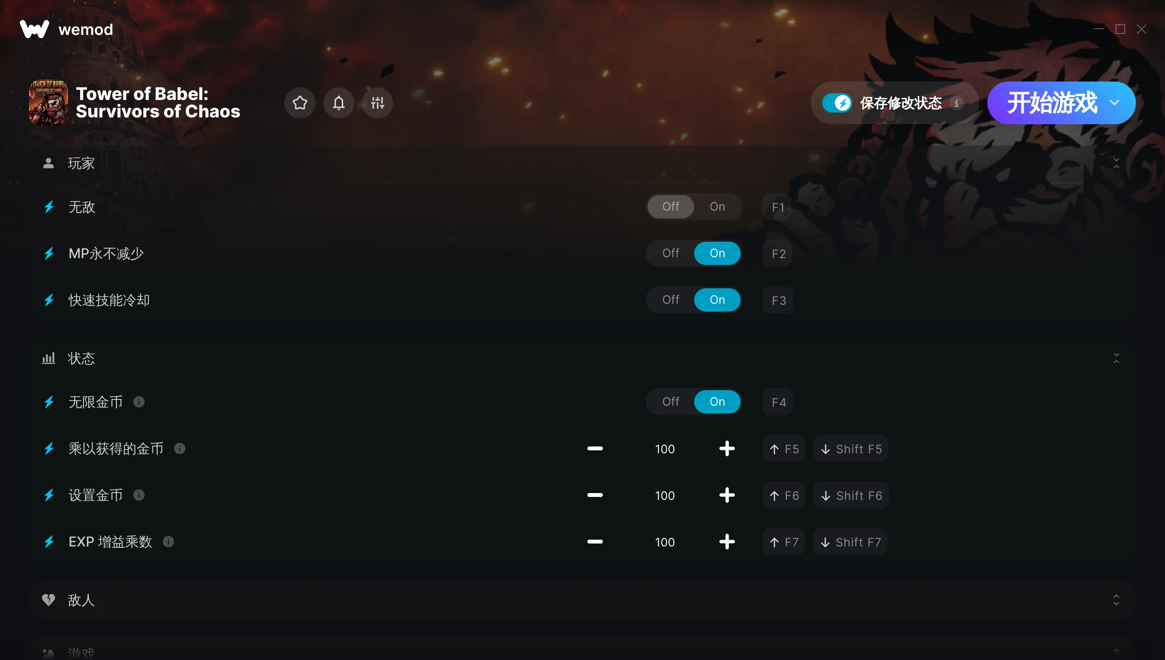 如何在 Tower of Babel: Survivors of Chaos 中使用修改器?WeMod 会安全地扫描并显示你的 PC 上已安装的所有游戏。只需从列表中选择一款游戏并点击“开始游戏”,即可快速启动游戏。当游戏完成加载并进入游戏画面后,你就可以开启各种修改了!这些修改适用于我的游戏版本吗?WeMod 还能使用先进技术自动检测你的游戏版本,并告知你该游戏是否支持修改。如果暂无修改,你可以选择直接进入游戏或提交制作申请!