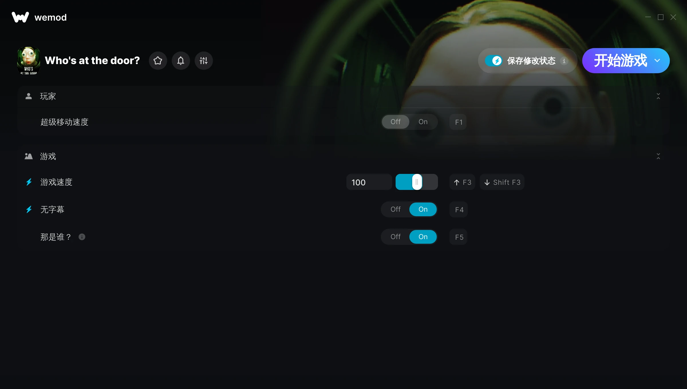 如何在 Who's at the door? 中使用修改器?WeMod 会安全地扫描并显示你的 PC 上已安装的所有游戏。只需从列表中选择一款游戏并点击“开始游戏”,即可快速启动游戏。当游戏完成加载并进入游戏画面后,你就可以开启各种修改了!这些修改适用于我的游戏版本吗?WeMod 还能使用先进技术自动检测你的游戏版本,并告知你该游戏是否支持修改。如果暂无修改,你可以选择直接进入游戏或提交制作申请!